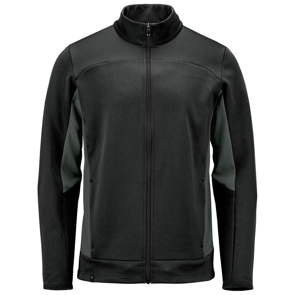 Stormtech Men's Black/Graphite Appaloosa Knit Jacket with a custom logo is a versatile look that can easily transition from the mountains to the city streets. The sleek polyester and fleece jacket can easily be layered over your favorite shirt or tee to create a look with contour side panels that show your style. Perfect for work, play, or a night out when you need to stay warm and protected.