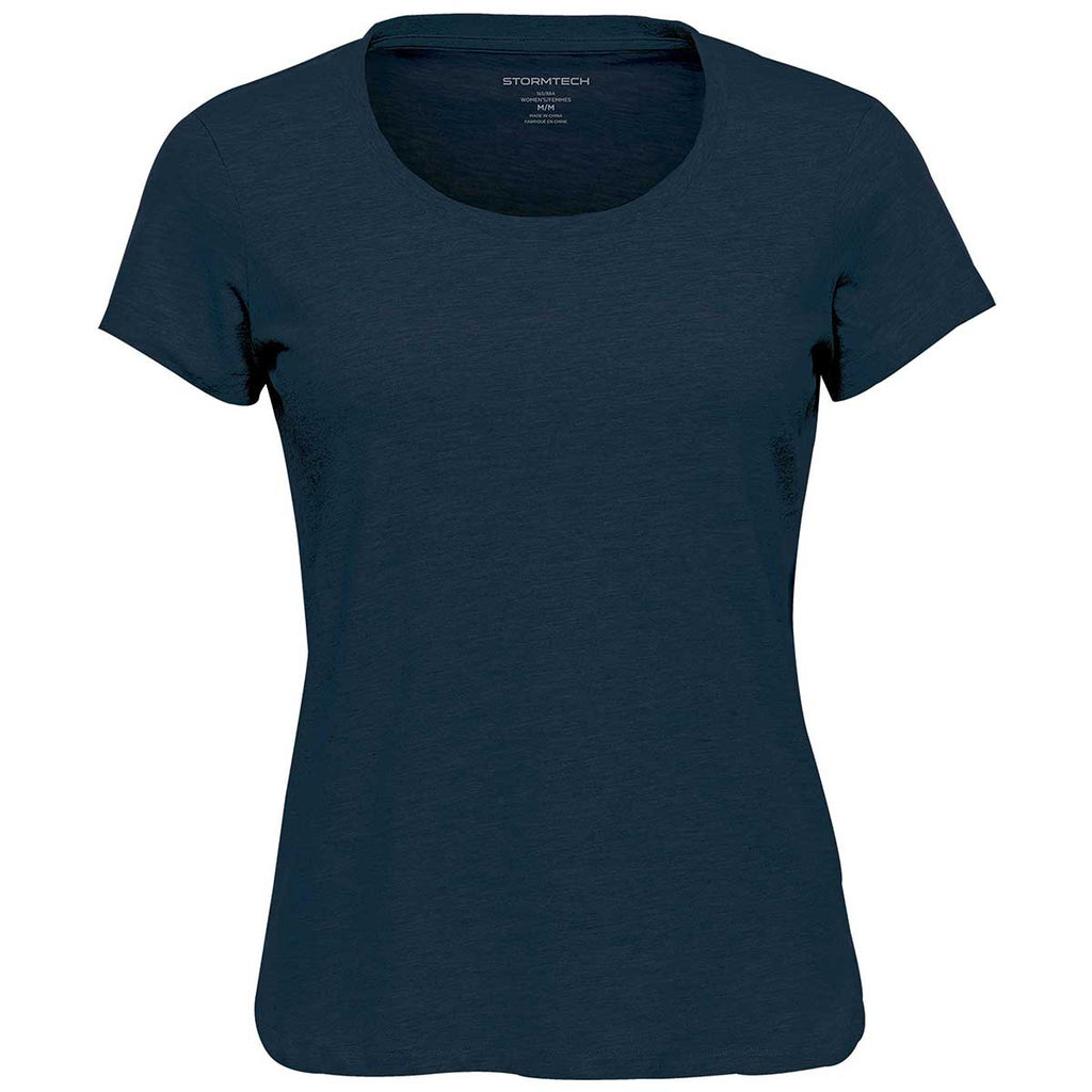 Keep it simple with a custom Stormtech Women's Navy Torcello Crew Neck Tee. Add a company logo screen print to this carefree tee to use as employee apparel or at trade events to gain attention. The fun-loving design will turn heads as your logo will be the center of attention. Easy to layer in cold weather or wear alone every day, this tee is a staple for every wardrobe. The simplicity allows your corporate design to be the focus as you go about the day. Place an order to have these on shelves as soon as possible.Highlights
