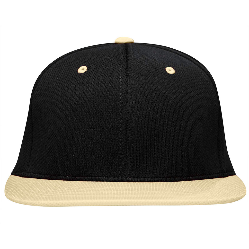 Turn heads with a custom embroidery Pacific Headwear Black/Vegas Premium P-Tec FlexFit Cap made of performance fabric and completed with a pro-stitched finish. The base color is made bolder with contrast colored eyelets and flat visor. Add a company logo to use as part of employee apparel to get your employees noticed or give them as custom gifts to loyal customers. The graphite undervisor with shapeable visor conforms to what you want and moisture wicking makes it comfortable for all day wear, even in warmer environments. A closed back means this is a one size fits most design.Highlights
