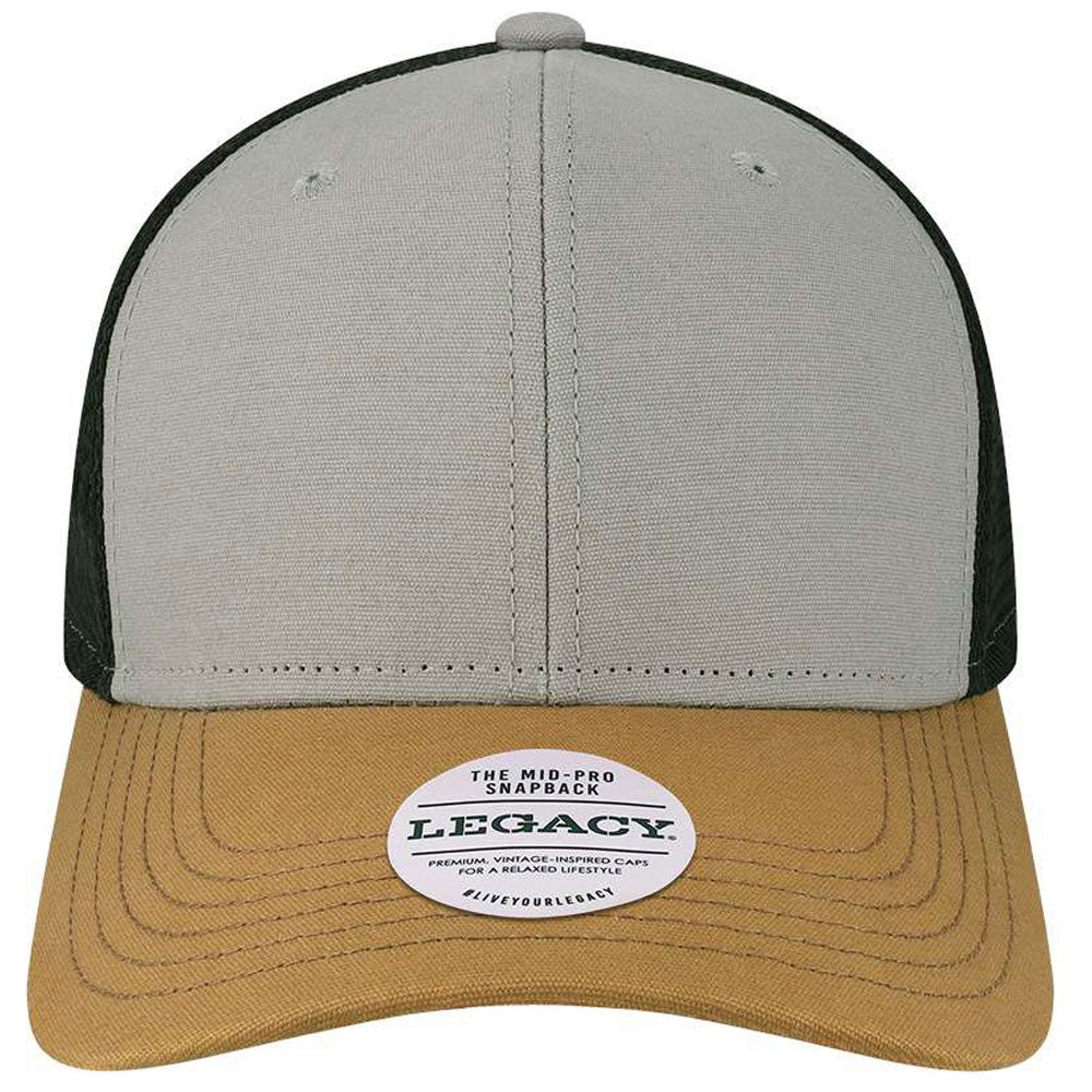 Create a promotional accessory that is big on vintage inspired by style adding your company's custom logo or design to the front of the Legacy Grey/Caramel/Black Mid-Pro Snapback Trucker Cap. Classic details like a mesh back and adjustable snapback make it perfect for audiences of all ages.Highlights