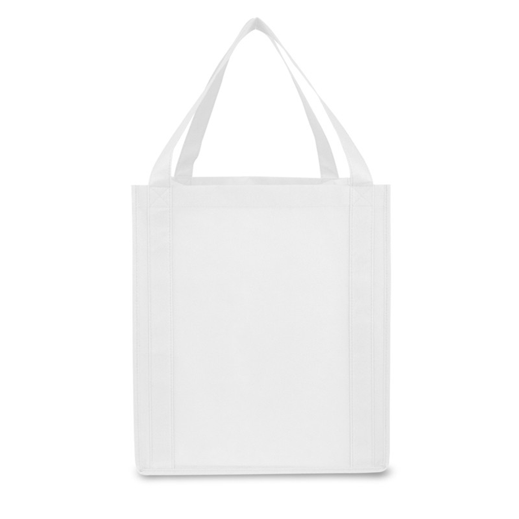 The Primeline White Saturn Jumbo Non-Woven Grocery Tote will provide a perfect blank canvas for your company’s custom logo or design. Great for tradeshows, getting groceries, or use around the office, it’s made from a durable recycled material and can hold up to 11lbs.