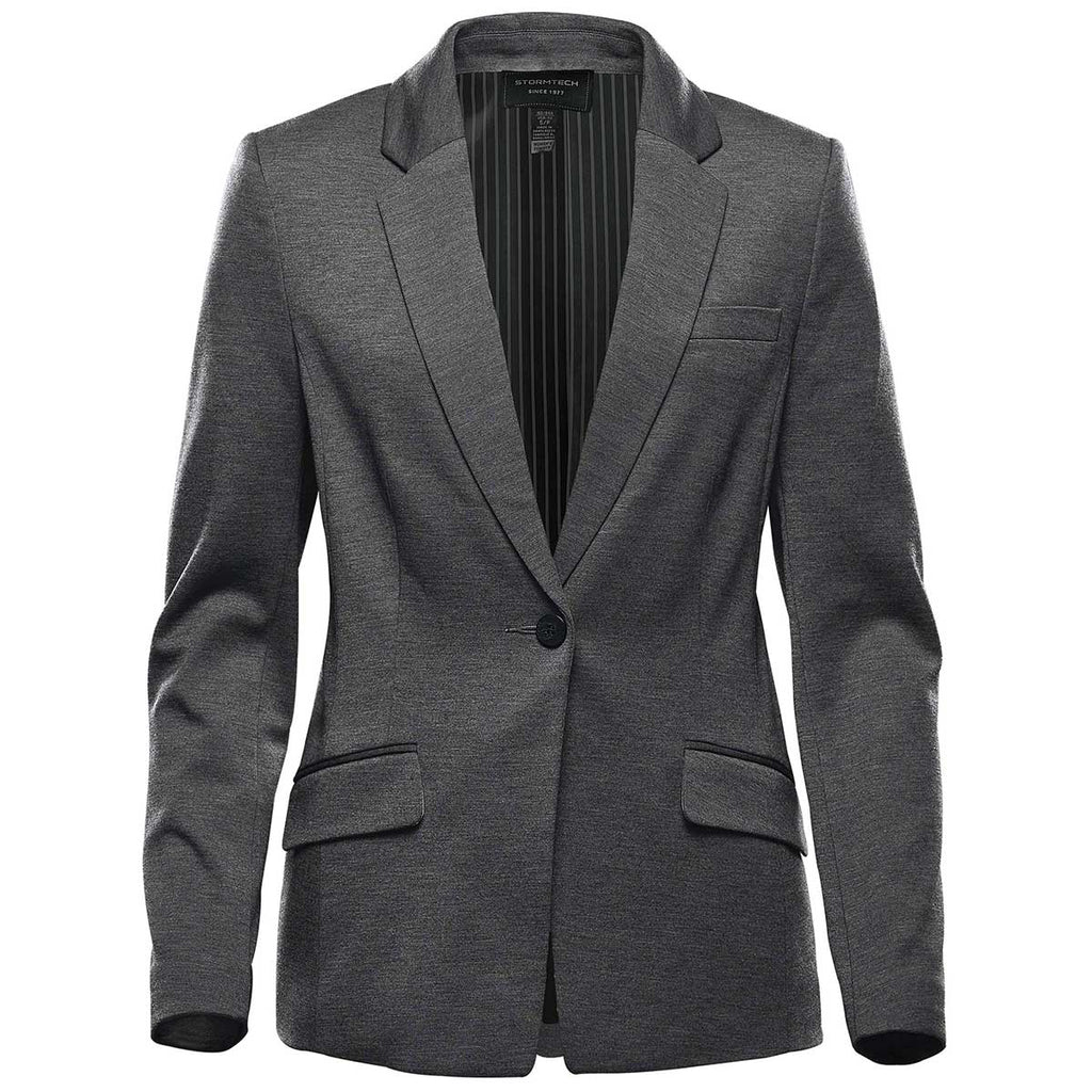 Corporate apparel has never looked better than the Stormtech Women's Graphite Heather Delano Knit Blazer. The form fitting, princess cut blazer is highly versatile with notched lapel collar, functional pockets, and high-quality lining. Add a company logo to use as employee apparel or add to your wardrobe. Easily go from day to night as this blazer can be paired with a tank or nice dress shirt for multiple looks. This blazer will have you feeling as professional as you look at a great price.Highlights