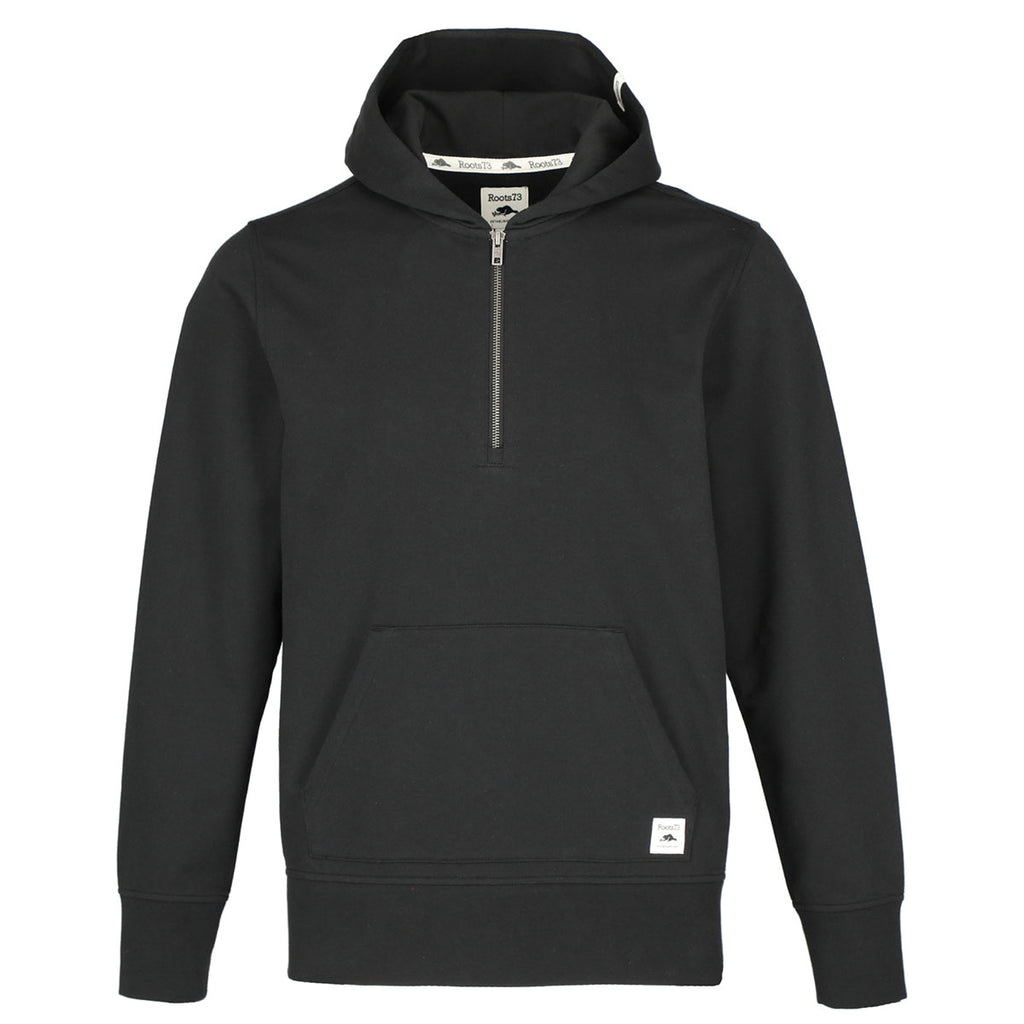 Roots73 Unisex Black Canmore Eco Quarter Zip Hoodie with embroidery is a simple and fun way to create uniforms, gifts, or workout gear with ease. Ideal for personal trainers or athletes, this is a true must-have. The attached hood and quarter-zip style make this easy to layer, no matter the weather. Place an order today.Highlights