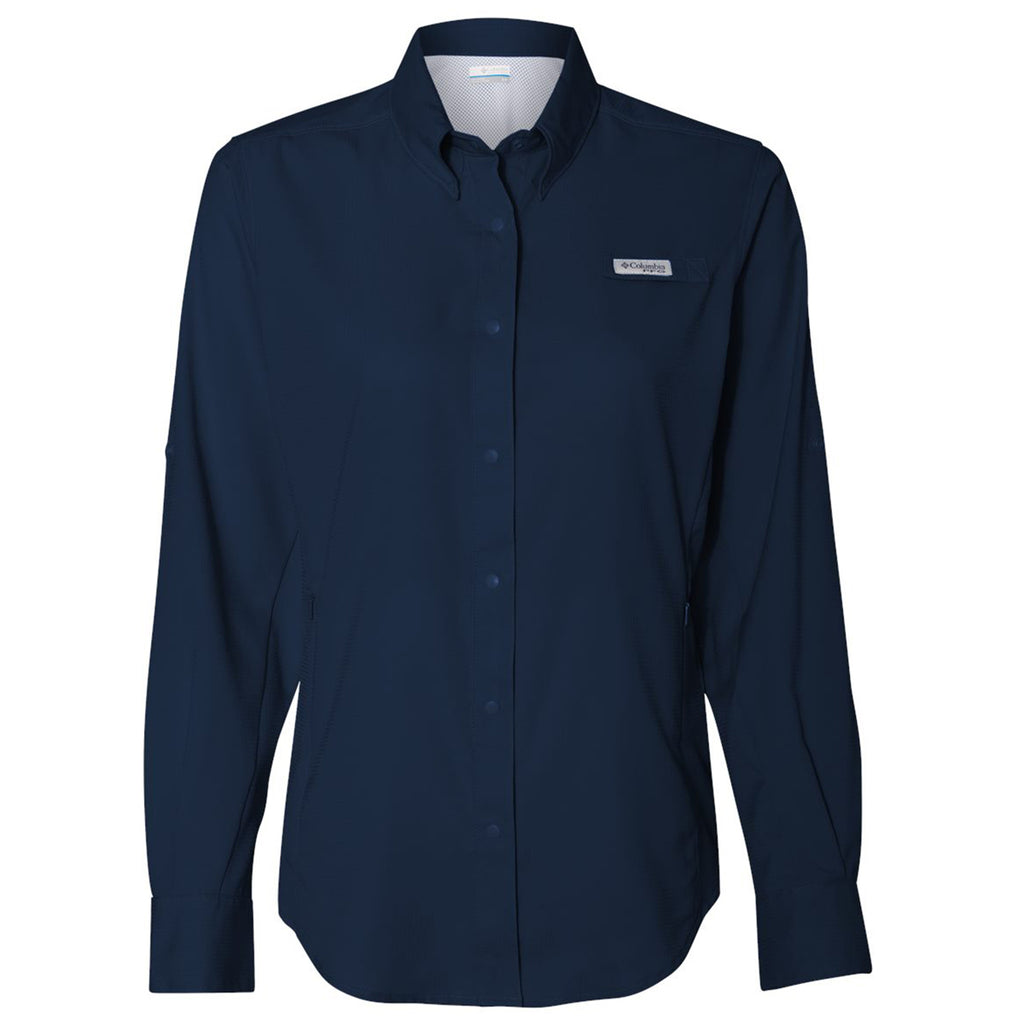 Columbia Women's Collegiate Navy PFG Tamiami Long Sleeve Shirt with a corporate logo is ideal for trail guides, adventurers, and those who work hard daily. Made of polyester ripstop with sun protection and Omni-WICK with a vented back, this is a must-have for those who need something tough yet comfortable for all-day wear.This product cannot ship outside of the United States.