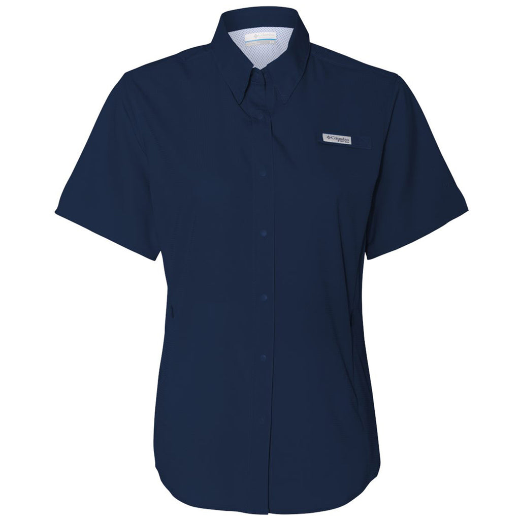 Create a corporate logo for the Columbia Women's Collegiate Navy PFG Tamiami Short Sleeve Shirt to enjoy a classically styled form of workwear or a shirt to share with those who love your company and brand. The polyester ripstop material is durable and comfortable with UPF 40 sun protection, moisture wicking, and zippered hand pockets. Made for outdoor adventures like fishing, this is a true must-have.This product cannot ship outside of the United States.