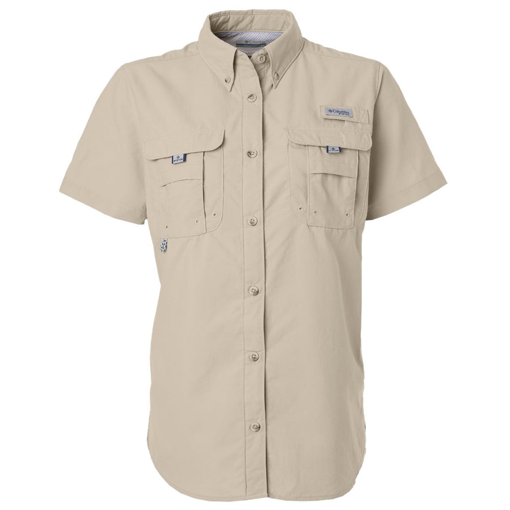 Choose a corporate logo for the Columbia Women's Fossil PFG Bahama Short Sleeve Shirt made of Tactel nylon. This shirt is ready for hard work and adventure with broad spectrum UPF 50 sun protection, quick-dry technology, a rod holder, and a utility loop. The vented shirt keeps you cool, whether hunting, fishing, or working all day.This product cannot ship outside of the United States.