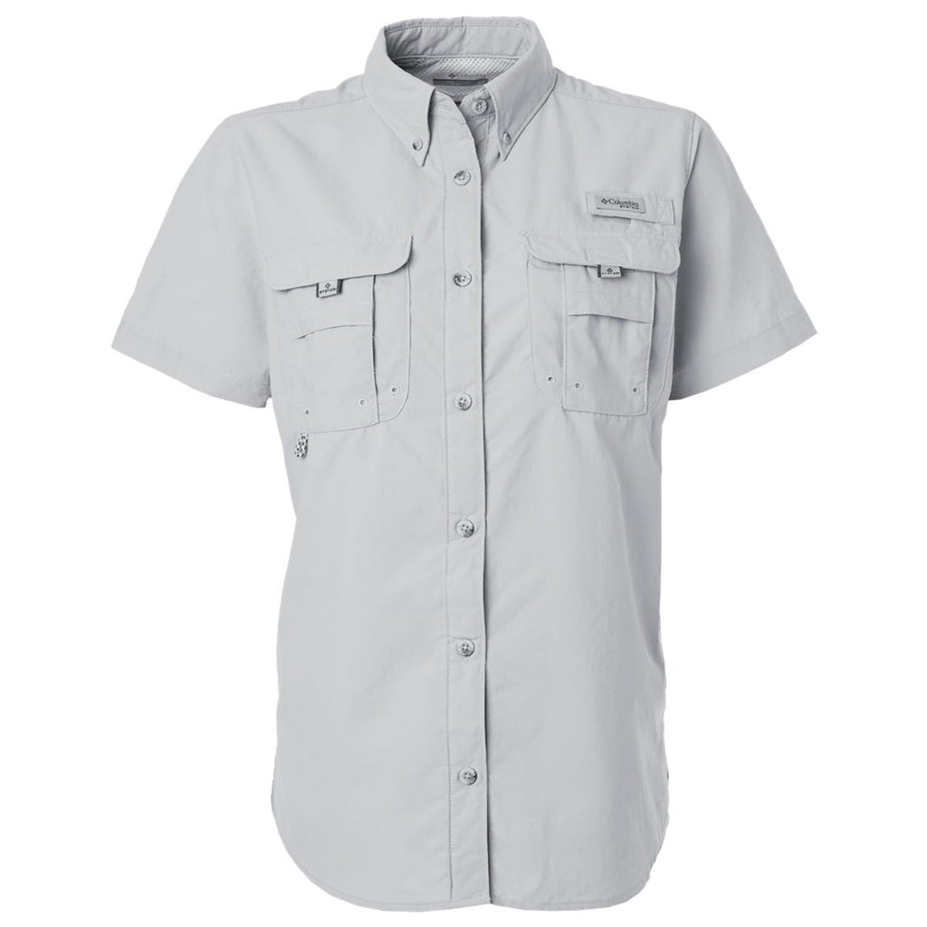 Choose a corporate logo for the Columbia Women's Cool Grey PFG Bahama Short Sleeve Shirt made of Tactel nylon. This shirt is ready for hard work and adventure with broad spectrum UPF 50 sun protection, quick-dry technology, a rod holder, and a utility loop. The vented shirt keeps you cool, whether hunting, fishing, or working all day.This product cannot ship outside of the United States.