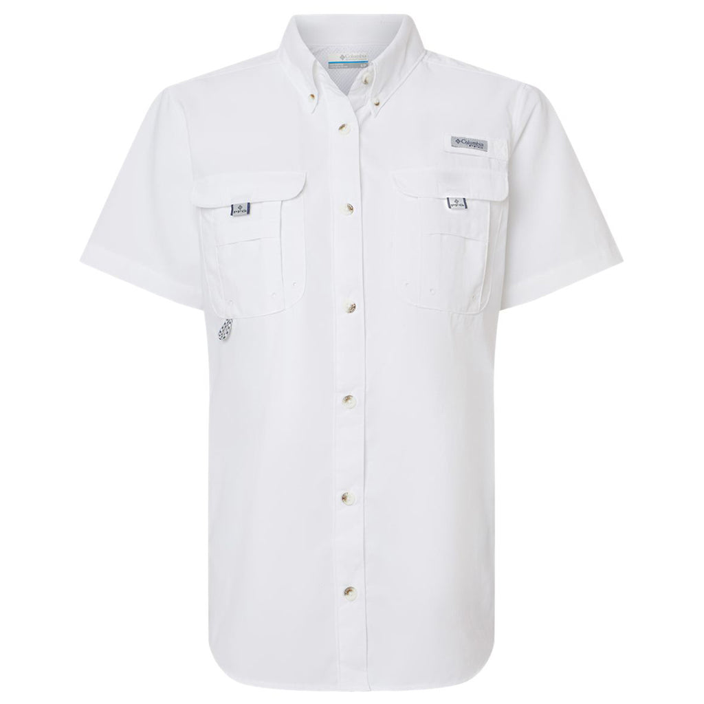 Choose a corporate logo for the Columbia Women's White PFG Bahama Short Sleeve Shirt made of Tactel nylon. This shirt is ready for hard work and adventure with broad spectrum UPF 50 sun protection, quick-dry technology, a rod holder, and a utility loop. The vented shirt keeps you cool, whether hunting, fishing, or working all day.This product cannot ship outside of the United States.