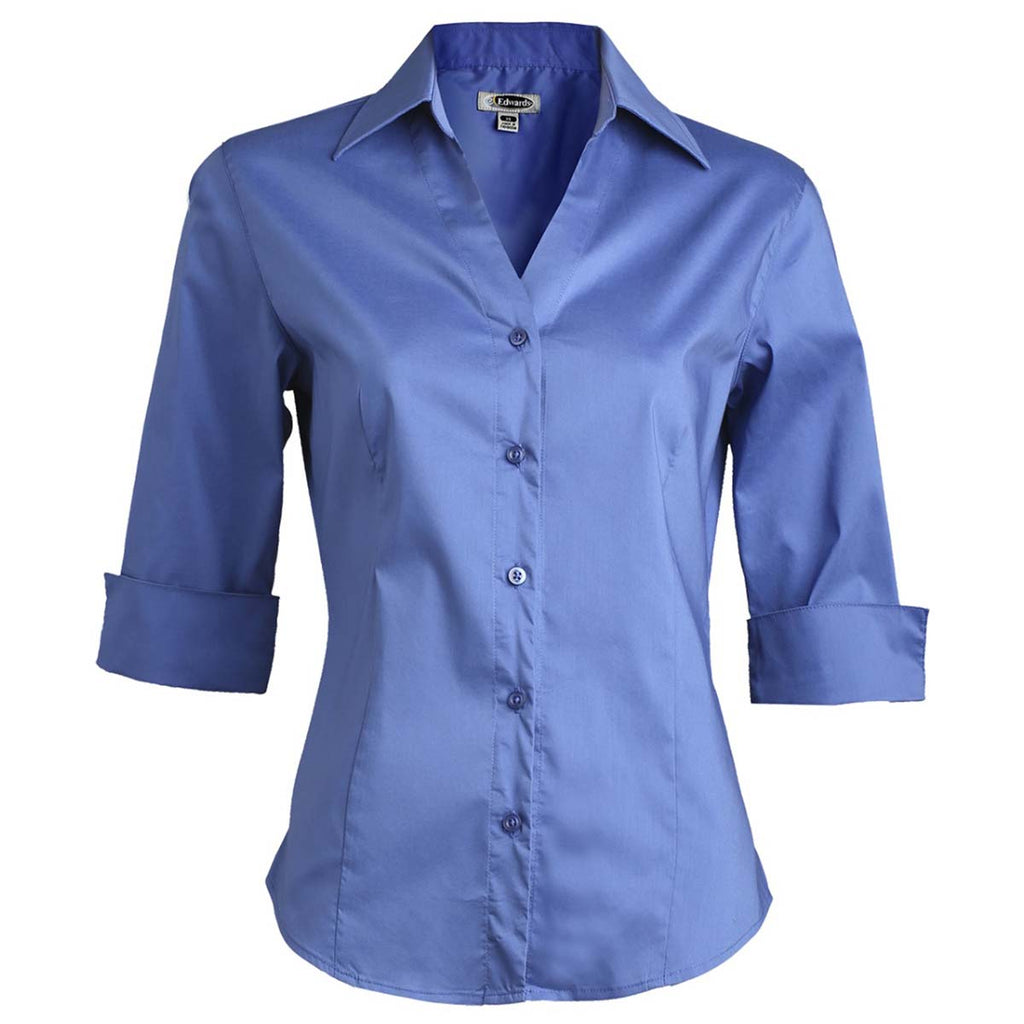 Create corporate apparel for yourself or employees with a custom Edwards Women's French Blue Tailored V-Neck Stretch 3/4 Sleeve Shirt. Available in seven various colors, this cotton rich polyester and spandex blend provides a tailored fit that is great for daily wear. Add a corporate embroidery of your choice to truly showcase your company. Small extras like 3/4 sleeves with vents, French placket, and soft collar, make this shirt would be perfect for hospitality apparel as the face of your company. Place an order for several wrinkle resistant, machine washable shirts that will last for a long time both on and off the job.Highlights