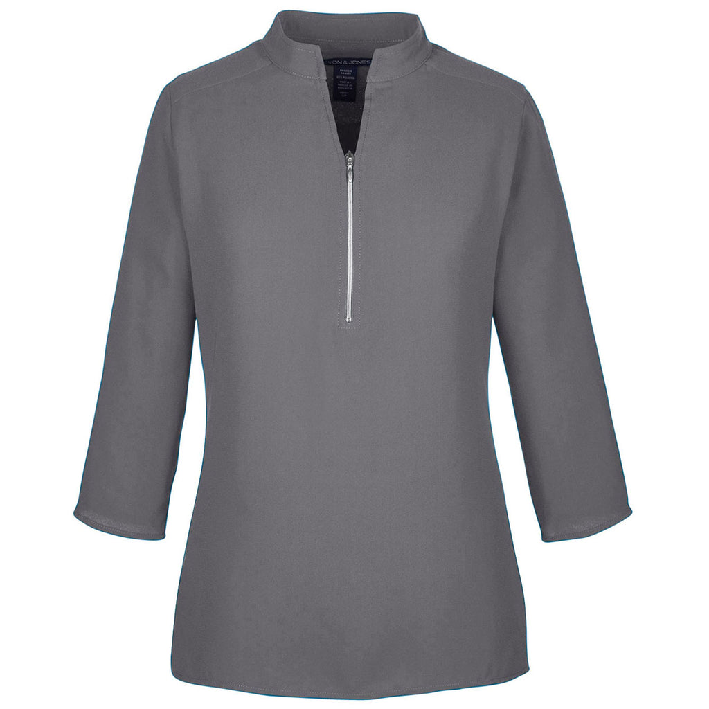 Try out a custom logo on the Devon & Jones Wome Graphite Perfect Fit 3/4-Sleeve Crepe Tunic for a unique form of employee apparel that will stand out. Add a company logo to the 100% polyester crepe tunic to allow guests to easily identify those in charge and seek services as needed. The center front metal zipper has an auto-lock teardrop slider and the side slits allow for ease of movement. A perfect fit style with a longer length means full coverage whether bending stretching or whatever else the job requires. Ideal for sales staff, those who work closely with people offering one on one services, and much more.Highlights