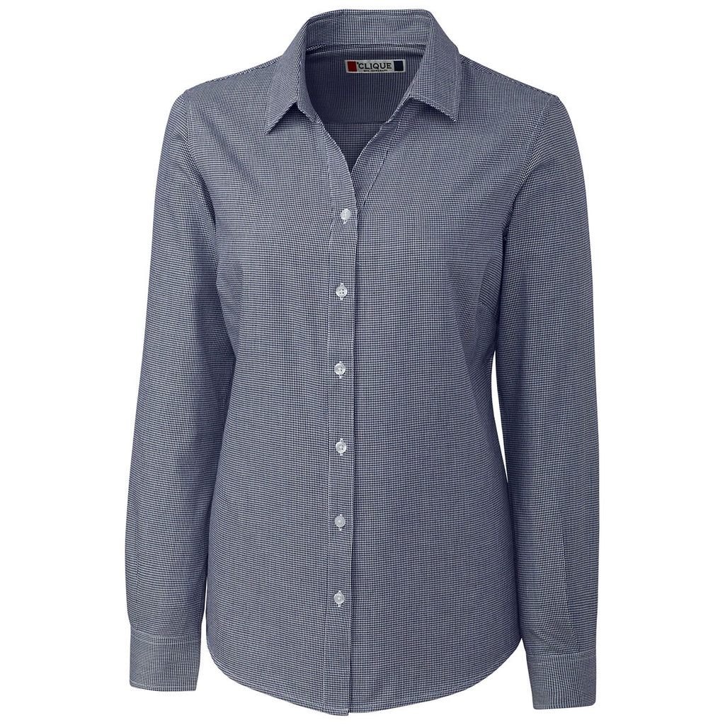 The Clique Women's Navy/White Long Sleeve Granna Stain Resistant Houndstooth shirt offers a professional custom logo shirt option that can be worn almost anywhere. With your company logo added to the front, this long-sleeve shirt makes the perfect employee apparel item for casual Fridays at the office. Choose from a variety of eye-catching color schemes and select the one that accommodates your logo perfectly. Welcome features of this shirt include a 60% cotton twill/40% polyester blend fabric, spread collar, Y neck, French darts, buttoned cuff, and curved hem.Corresponding Men's Style:Clique Men's Navy/White Long Sleeve Granna Stain Resistant Houndstooth Shirt