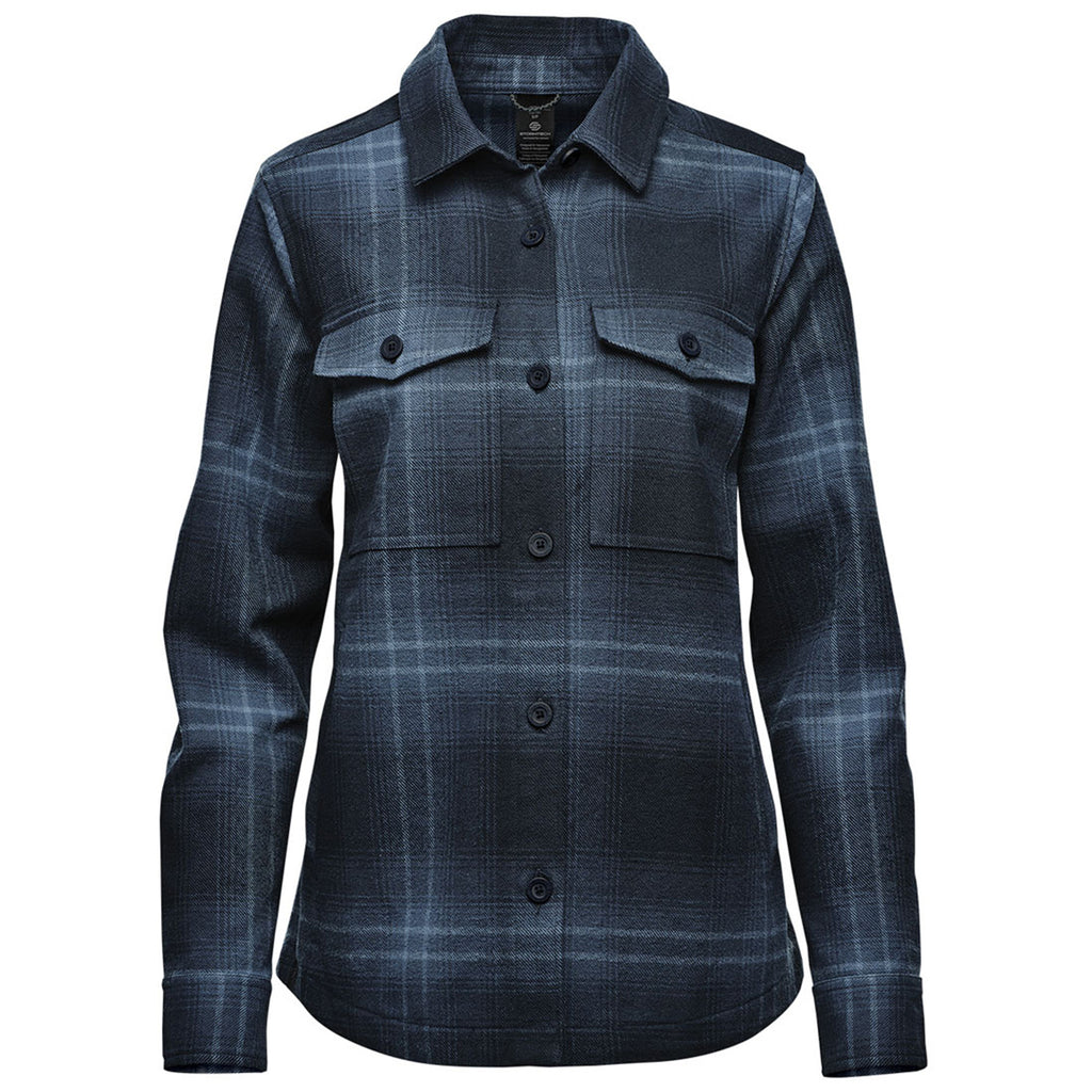 Stormtech Women's Midnight/Dusk Highland Plaid Shacket with a custom logo is a fun take on a traditional flannel. The easy-to-wear and layer shacket is an urban outdoor staple whether heading to school, work, or on an adventure of your choosing. The durable buttons and soft feel make this shacket an instant favorite for everyone who wants to create their own style.