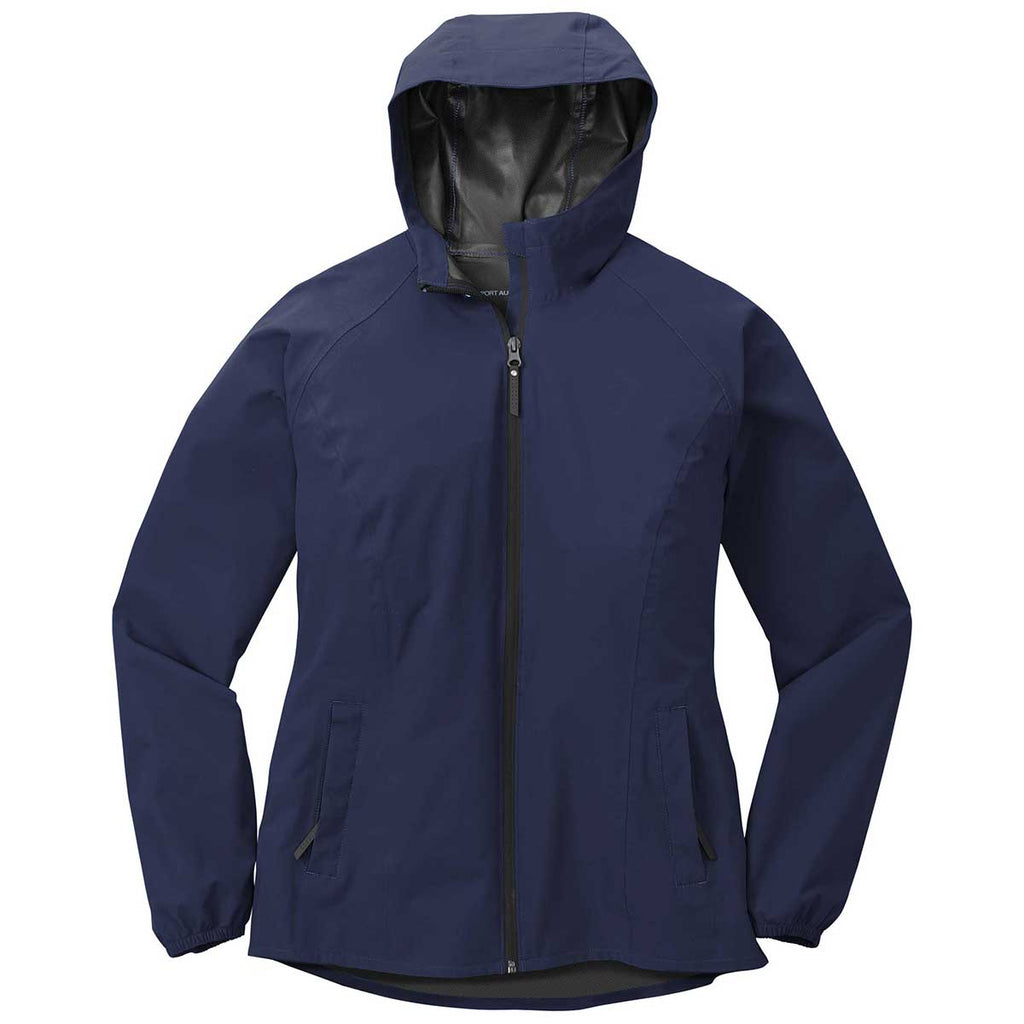 Go play in the rain with a custom embroidered Port Authority Women's True Navy Essential Rain Jacket. Perfect as a company uniform for those who have to brave the great outdoors in less than ideal weather, this year round must have is fully seam sealed 8K/5K waterproof. The breathable 2.5 layer jacket with DWR finish has a 100% polyester shell with waterproof center zipper, interior storm flap, chin guard, and front zippered pockets. The elastic cuffs keep clothing protected as you enjoy outdoor team events or a simple walk to the office. Add your company logo so employees will be recognizable or use these as end of the year gifts.Corresponding Men's Style:Port Authority Men's True Navy Essential Rain Jacket