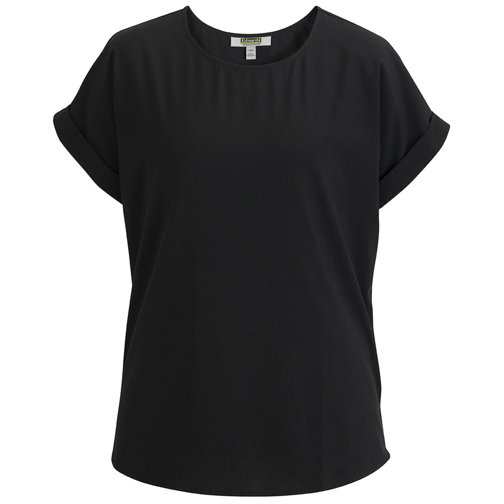 Add an embroidered custom logo to the Edwards Women's Black Dolman Blouse for a clean cut look that can serve multiple functions. The polyester rich spandex blend is ideal for uniforms with rolled-up sleeves and a pullover style that can be home laundered and is wrinkle resistant. Add a corporate logo for employee wear that can be used in multiple locations. Place an order today.Highlights