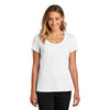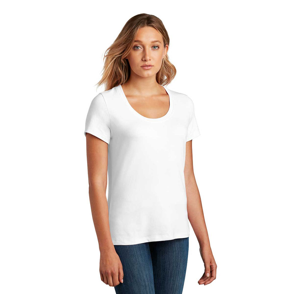 Be comfortable all day with a heat transfer District Women's White Flex Scoop Neck Tee. With just a hint of stretch this traditional fitting scoopneck is a combination of combed ring spun cotton, poly, and spandex with a rib knit neck and slight high-low rounded hem. Add a company logo to offer these at trade shows or as employee gifts or add a corporate logo to use as employee uniforms or at team events. This tee is far from basic with the all day comfort that we all want and deserve. A variety of sizes and colors are available to choose from to meet your design needs.Corresponding Men's Style: District Men's White Flex Tee