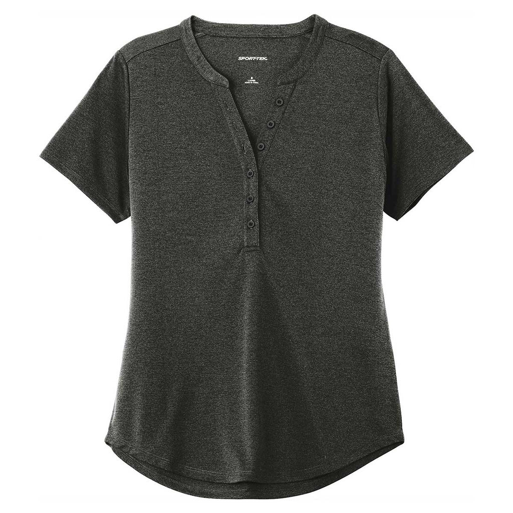 Rock an updated classic look with an embroidered Sport-Tek Women's Black Heather Endeavor Henley. The lightweight 100% polyester Henley has a subtle heather texture with moisture wicking technology to allow you to work and play hard. Perform your best in the V-neck with a 6-button placket and scalloped hem for a bit of extra coverage. Add a corporate embroidery to wear these to corporate events or to use as company uniforms for daily wear. The slightly fitted look is professional, yet fun and can be easily layered with a jacket or vest as needed. Place your order today to update your personal wardrobe or offer these as gifts.Corresponding Men's Style:Sport-Tek Men's Black Heather Endeavor Polo