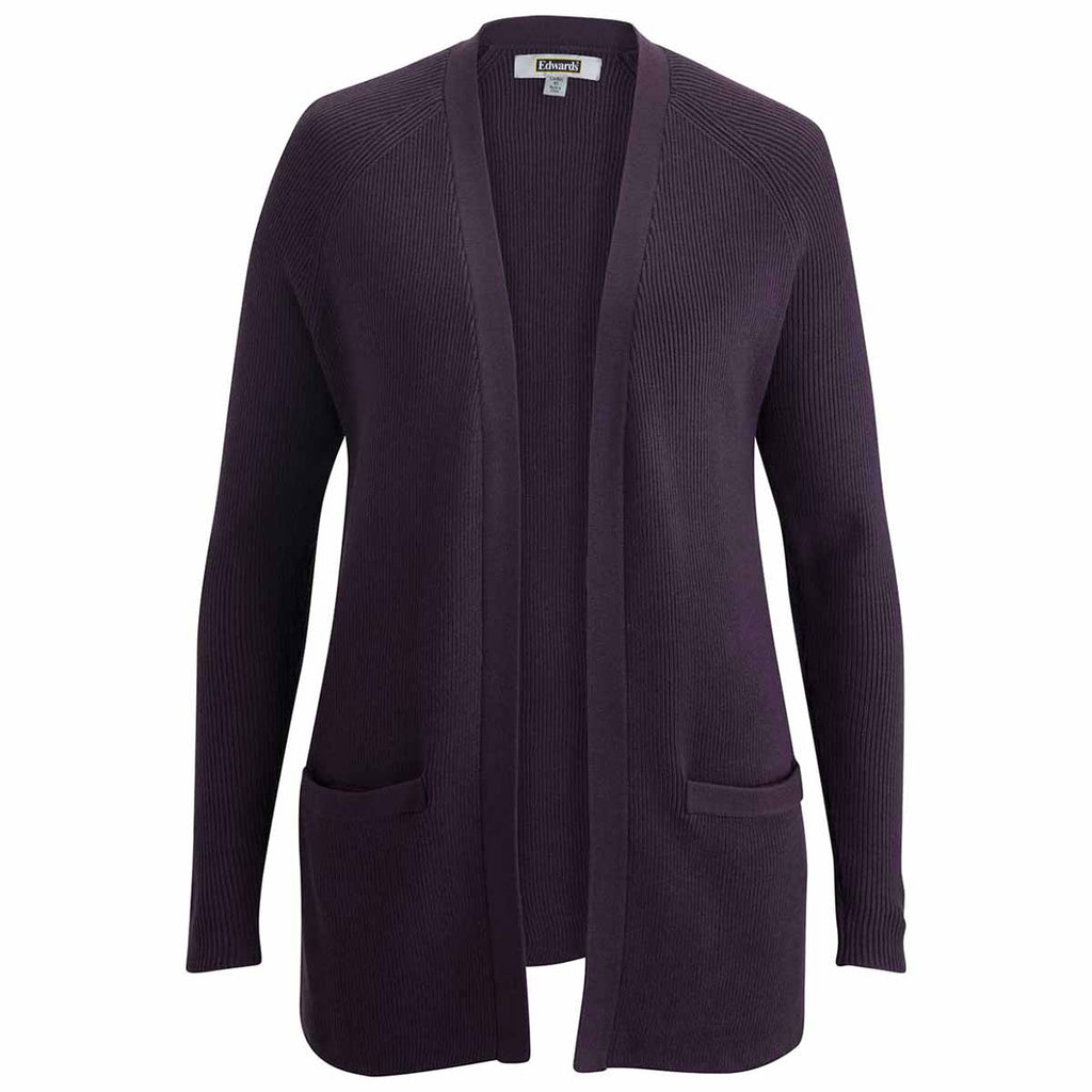 The ladies on your team will look chic and contemporary when they're outfitted in the Edwards Women's Eggplant Open Front Cardigan With Pockets. An effortless layering piece that aligns with current fashion trends, it's made from a fine gauge knit fabric and will highlight your company's custom logo or design.