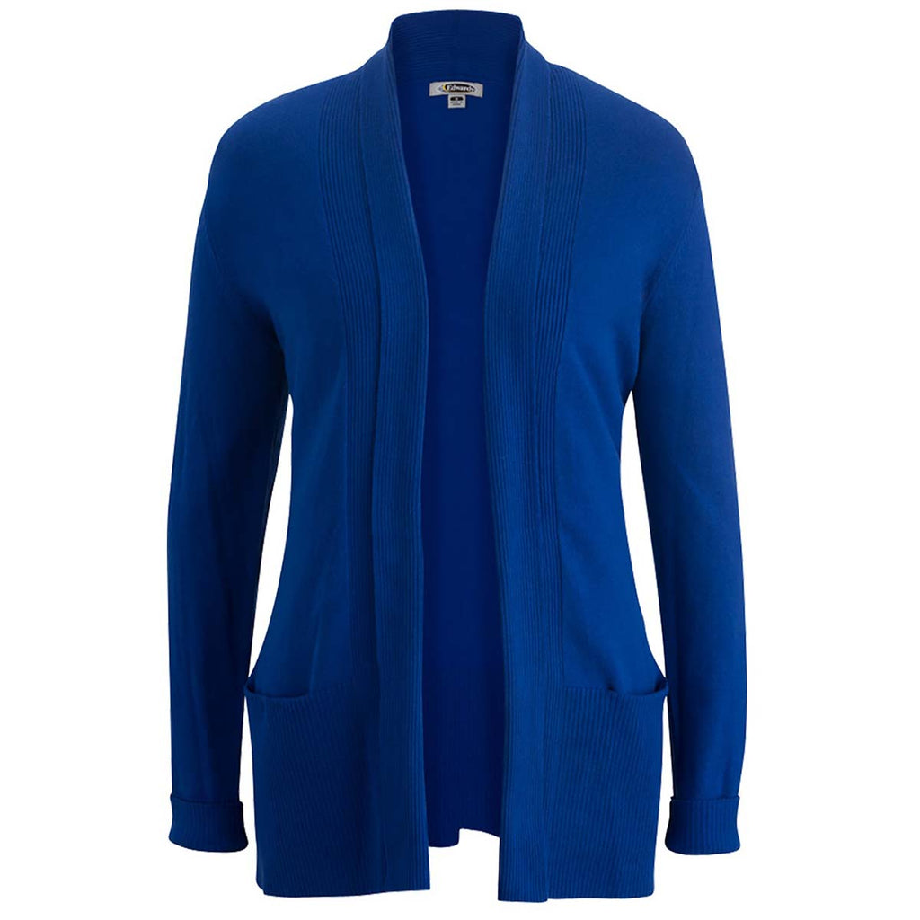 Create a custom look that will be envied with the Edwards Women's Cobalt Shawl Collar Cardigan. Made of a cotton rich, acrylic and nylon blend in a lightweight fine gauge knit traditional style. The open style with turn back shawl collar, ribbed bottom, and set in pockets create a look that works as employee apparel or as part of hospitality apparel for those who interact with customers daily. Your corporate embroidery will stand out on the flattering low hip length silhouette that can be used at home or the office with ease.Highlights