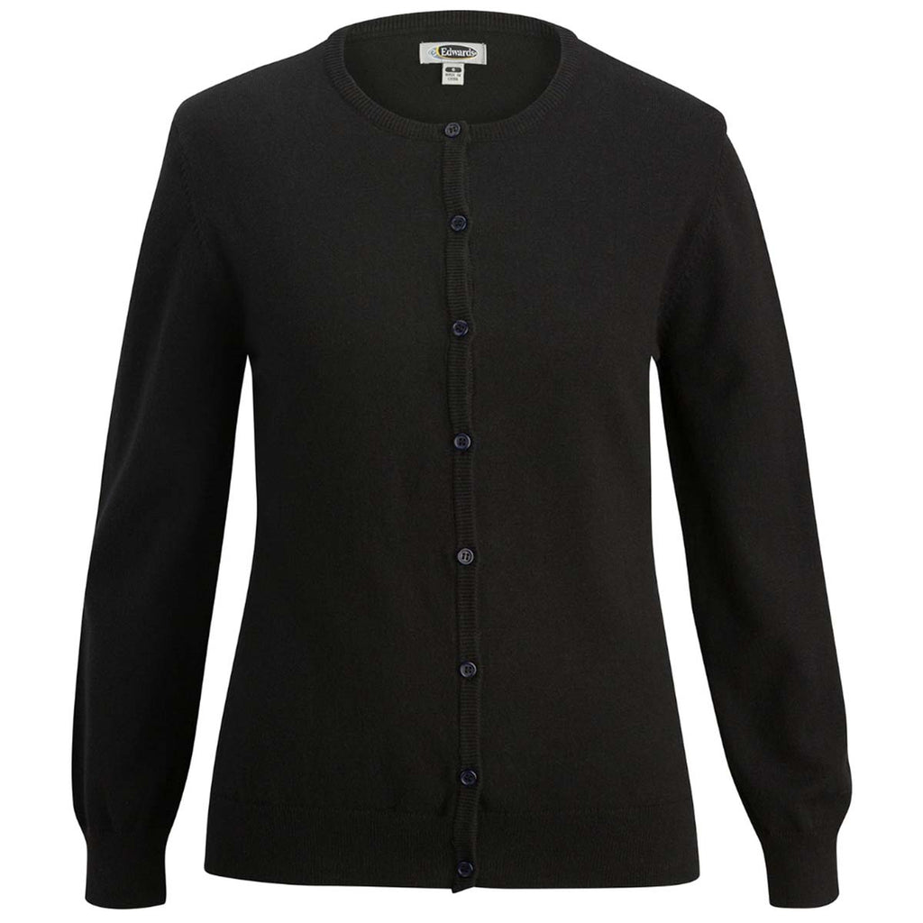 An updated classic custom look is created by the Edwards Women's Black Jewel Neck Cardigan. Made of a blend of cotton rich, acrylic, and nylon this jewel neck cardigan can be custom embroidered as corporate apparel or additional employee apparel that will look charming and offer warmth on chilly days. The matching button placket and soft finish provides a flattering fit that is great for layering. Available in blue, red, and black color options, your custom logo will stand out and leave an impression on all those who view it.Highlights