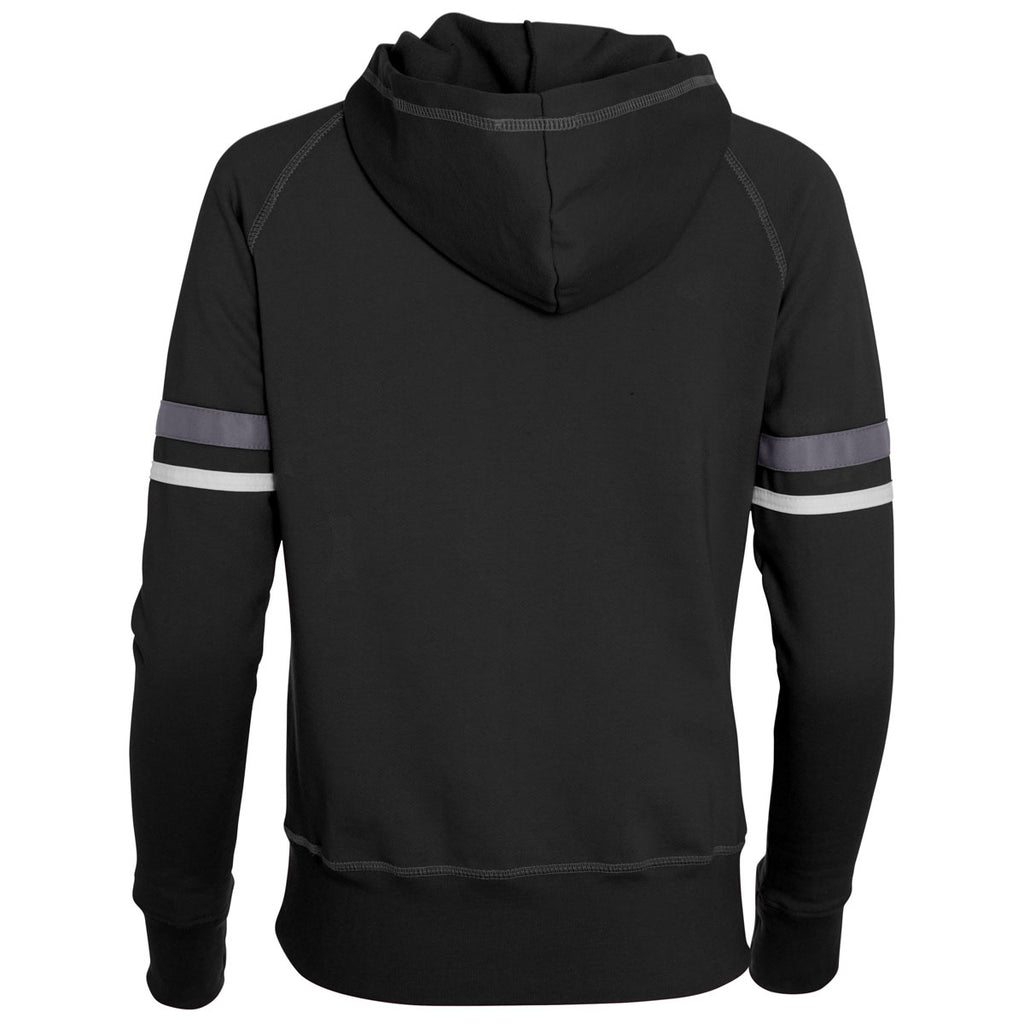 Add embroidery to the Augusta Women's Black/White/Graphite Spry Hoodie for an updated urban look that will be an instant hit. This creative and colorful design is made of a 50/50 blend of smooth athletic fleece in a feminine fit. A scuba shaped hood with contrast color drawcord and raglan sleeves only add to the overall look. Add a company logo to give as employee gifts or a custom design to add to your own wardrobe choices for athletic wear. A front pouch pocket is perfect for small items and thumbholes add to the warmth of this heavier hoodie. Place an order today to make sure these are available as needed.