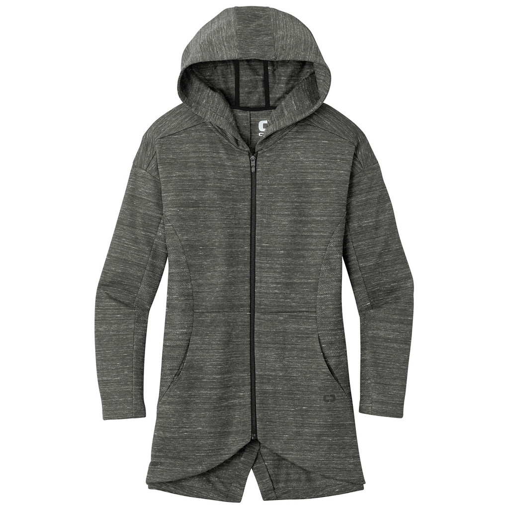 Enjoy a custom look with the OGIO Women's Tarmac Grey Heather Flux Full-Zip Hoodie. This unique hoodie is a fashion statement on its own with a clean, modern style. The 3-panel hood, drop shoulder, and curved front hem with a split back and drop-tail add to the appearance. Perfect for work, play, or going out.This product can only ship within the United States, Puerto Rico, Canada, and Mexico.