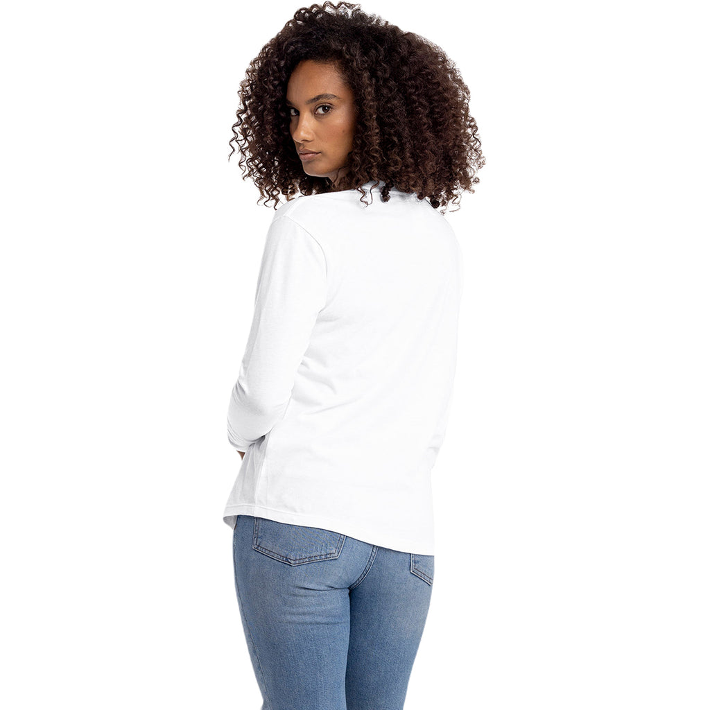 Design a custom logo for the Next Level Apparel Women's White Relaxed Long Sleeve T-Shirt. This simple long-sleeve tee offers a simple design that can create versatile looks. Perfect for chilly days outdoors with the family, hanging around the campfire, or layering at work.Highlights