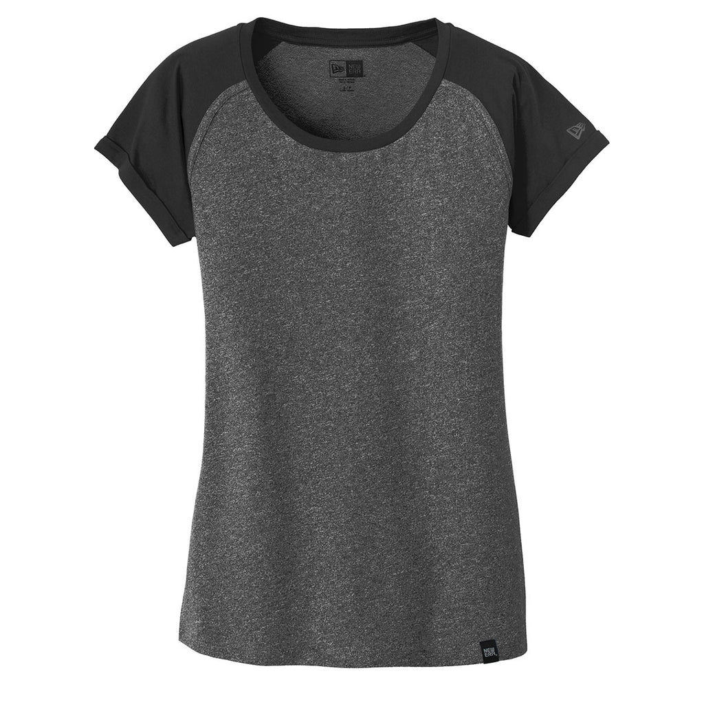 A unique color block design reveals a stunning appearance for the logoed New Era Women's BlackBlackTwistist Heritage Blend Varsity Tee. New Era combines plush softness and heritage motivated comfort to create a tee that maximizes comfort during your busy day. Reverse shoulder taping presents an appearance that your peers will immediately notice. Turn the compliments you receive for wearing the elegantly designed tee by attaching your company logo on the large imprint area. Rolled and tacked cuffs exude panache and the scalloped hem produces a symmetrical design worthy of winning fashion awards. Side vents double as style elements and areas for air to circulate near the body.