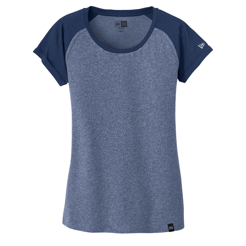 A unique color block design reveals a stunning appearance for the logoed New Era Women's Dark Royal/Dark Royal Twist Heritage Blend Varsity Tee. New Era combines plush softness and heritage motivated comfort to create a tee that maximizes comfort during your busy day. Reverse shoulder taping presents an appearance that your peers will immediately notice. Turn the compliments you receive for wearing the elegantly designed tee by attaching your company logo on the large imprint area. Rolled and tacked cuffs exude panache and the scalloped hem produces a symmetrical design worthy of winning fashion awards. Side vents double as style elements and areas for air to circulate near the body.