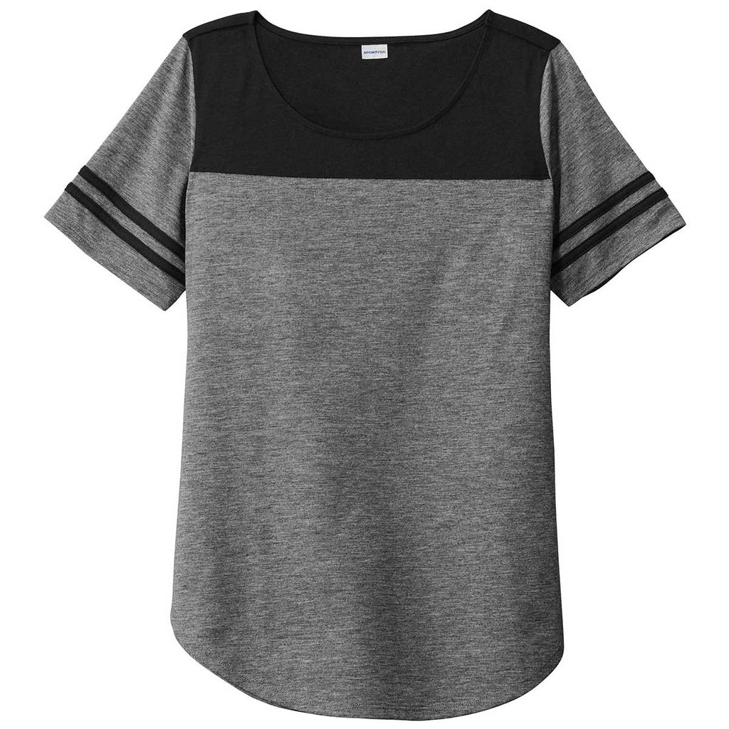 Be prepared on game day with a custom heat transfer Sport-Tek Women's Black Triad Solid/Dark Grey Heather PosiCharge Tri-Blend Wicking Fan Tee. This ultra comfortable tee can have the heat transfer design of your choosing carefully placed to make sure you stand out on game day. Perfect for team events with a corporate logo of sponsors or just to wear to support a specific player. Available in a wide range of colors and sizes, this poly, cotton, rayon jersey blend is moisture wicking for the days when the weather is toasty. Contrasting front and back yoke and stripes on the sleeves make this tee a sports fan's dream. Add a company logo to give as employee gifts that will be enjoyed on game days.Highlights