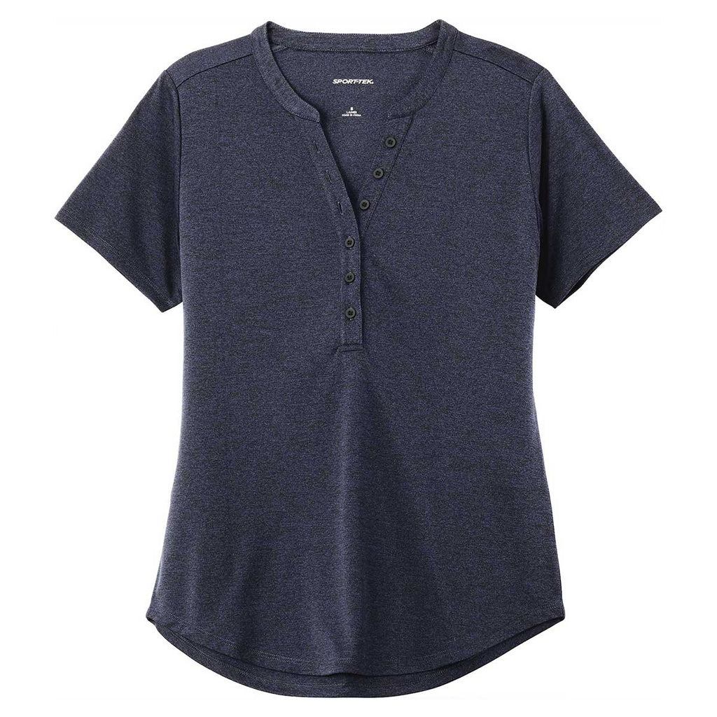 Rock an updated classic look with an embroidered Sport-Tek Women's Deep Navy Heather Endeavor Henley. The lightweight 100% polyester Henley has a subtle heather texture with moisture wicking technology to allow you to work and play hard. Perform your best in the V-neck with a 6-button placket and scalloped hem for a bit of extra coverage. Add a corporate embroidery to wear these to corporate events or to use as company uniforms for daily wear. The slightly fitted look is professional, yet fun and can be easily layered with a jacket or vest as needed. Place your order today to update your personal wardrobe or offer these as gifts.Corresponding Men's Style:Sport-Tek Men's Deep Navy Heather Endeavor Polo