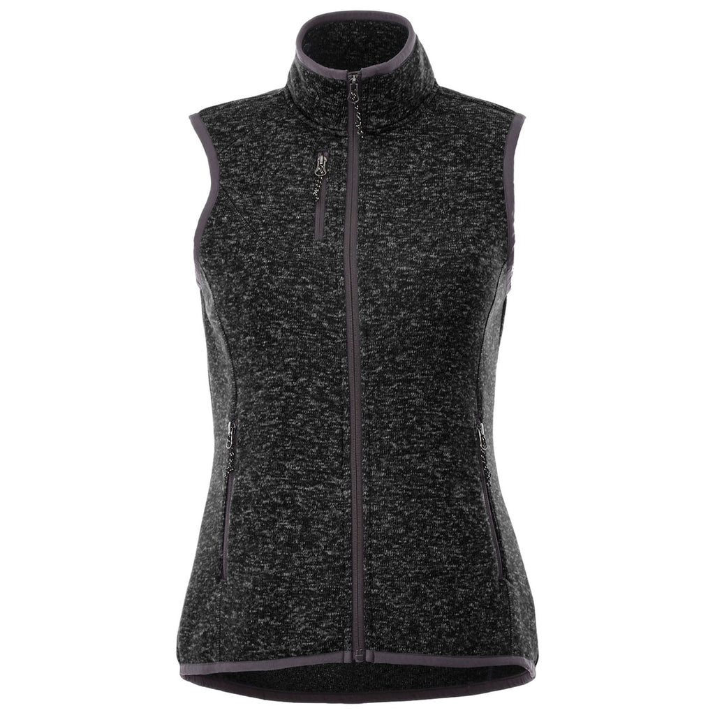 The Elevate Women's Black Smoke Heather Fontaine Knit Vest for chilly transitioning days is the perfect canvas for your custom logo. It has a sporty line and can be a nice gift for your female employees. They will surely wear it over their sweater during chilly days. It is the ideal apparel item for the transitioning period. You can find it in three colors and has trendy sweater knit heatheret fabric. This vest is comfortable and practical, since it offers a pocket for your cell phone with a port for an earbud cord. Your employees can talk to their friends or listen to music during their hikes without having to hold their phone in their hands.Corresponding Men's Style:Elevate Men's Black Smoke Heather Fontaine Knit Vest