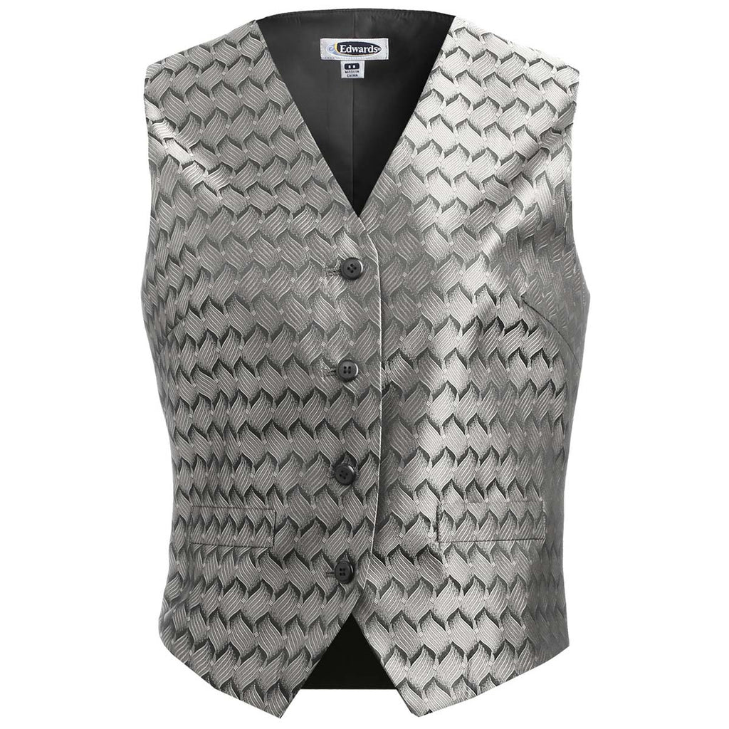 Create a truly custom look with the Edwards Women's Silver Swirl Brocade Vest in either black or silver. Perfect to wear alone or under a jacket, these bold vests with V-neck work well as employee apparel for those serving or working at banquets, casinos, or restaurants where a certain flair needs to be established. Add a company logo to use as corporate apparel with the vests that offer two inside pockets, black buttons on the placket, and a 100% polyester fabric that will stand up to long nights.Highlights