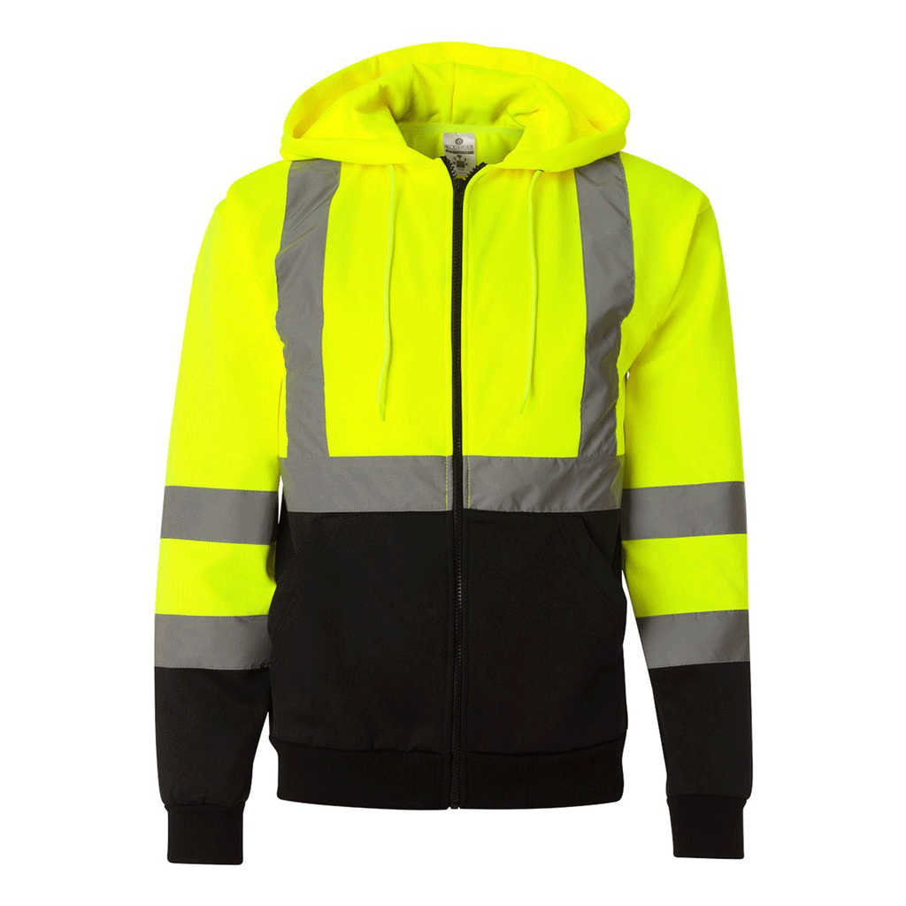 Add a custom logo to the ML Kishigo Men's Lime Hi-Vis Full-Zip Hooded Sweatshirt in bright safety options that will stand out in every type of weather. This 9 oz. polyester sweatshirt material full-zip is a must have for those who have to work outdoors or who enjoy exploring and need to be noticed. The black lower body and sleeves give the wearer a cleaner appearance. Fashion forward for industrial apparel, this hooded sweatshirt can carry a company logo to be used as workwear or be given as a custom gift for those who need a bit of protection from Mother Nature.Highlights