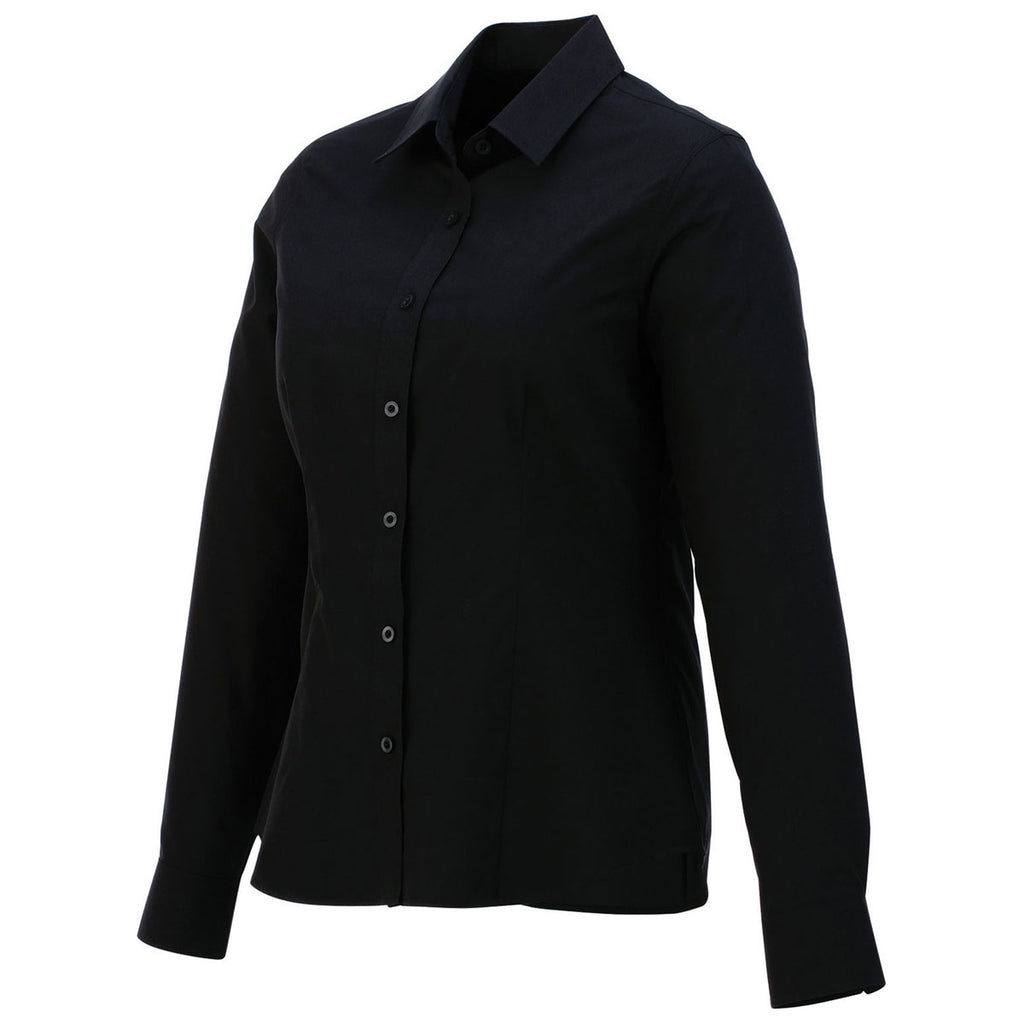 The Elevate Women's Black Preston Long Sleeve Shirt with your custom logo presents a sophisticated advertisement for your company. Every female employee will appreciate this gift so be sure you include it in your next corporate giveaway. You can even give it to your business partners. Whenever you have a corporate event, your employees can dress in these shirts, which will make them look sharp. Whether they are going to work or having a cup of coffee with their friends, your employees can wear this shirt and always look great. It is a 65% polyester, 35% cotton poplin woven fabric blend. It is available in a variety of colors making it a great option for work uniforms.Corresponding Men's Style: Elevate Men's Black Preston Long Sleeve Shirt