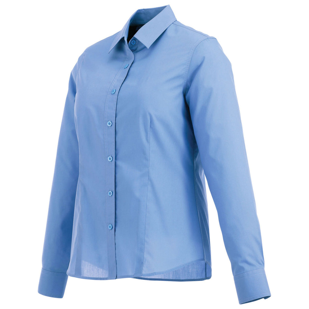 The Elevate Women's Sky Preston Long Sleeve Shirt with your custom logo presents a sophisticated advertisement for your company. Every female employee will appreciate this gift so be sure you include it in your next corporate giveaway. You can even give it to your business partners. Whenever you have a corporate event, your employees can dress in these shirts, which will make them look sharp. Whether they are going to work or having a cup of coffee with their friends, your employees can wear this shirt and always look great. It is a 65% polyester, 35% cotton poplin woven fabric blend. It is available in a variety of colors making it a great option for work uniforms.Corresponding Men's Style: Elevate Men's Sky Preston Long Sleeve Shirt