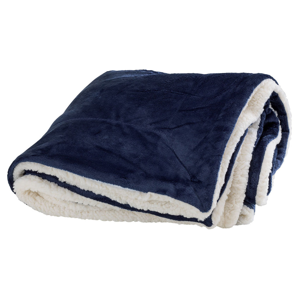Stay warm on frigid winter days by covering your body with the embroidered Vantage Navy Faux Mink Sherpa Blanket. Ideal as an extra blanket for your bed, or as another layer to keep you warm in a sleeping bag. The Sherpa blanket contains faux lamb's wool that delivers supreme comfort. The 100% polyester fabric resists the rips tears making it durable without sacrificing comfort. The concealed zipper located in the corner hem makes it easy to pack while traveling. Add your corporate logo to have an excellent gift at your company's next recruiting event.