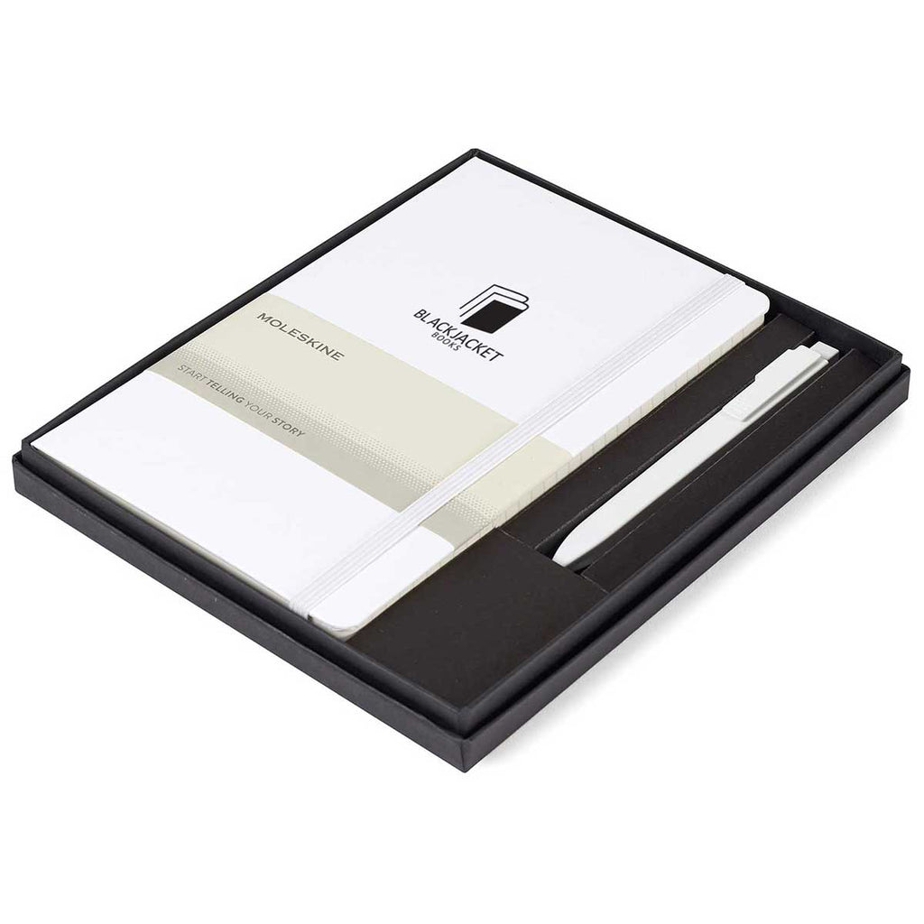 With your company logo, the Moleskine White Large Notebook and GO Pen Gift Set becomes a neat, customized combo that you can use as a limited-time event giveaway for special company trade shows and civic events. A classic notebook and pen pair that lets you put your thoughts into writing - the special pen clips on the hard cover of the notebook so you can jot down notes in an instant.