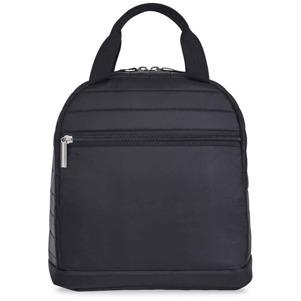 Enjoy a company logo on the Aviana Black Lunch Cooler with quilted details and a soft nylon fabric that makes it functional and fashionable to carry. Satin nickel accents add to the simple lunch cooler that is ready for every day use. A wonderful option to give as part of a new employee welcome package or as branded items at recruiting events. Dual zippers mean easy packing and organization and a front zippered pocket will hold cash, cards, or keys as needed. Add a custom logo to use at school, work, or on a road trip and easily find your cooler as needed. Place an order today for the grab and go option.The minimum order for this product is 48 pieces.