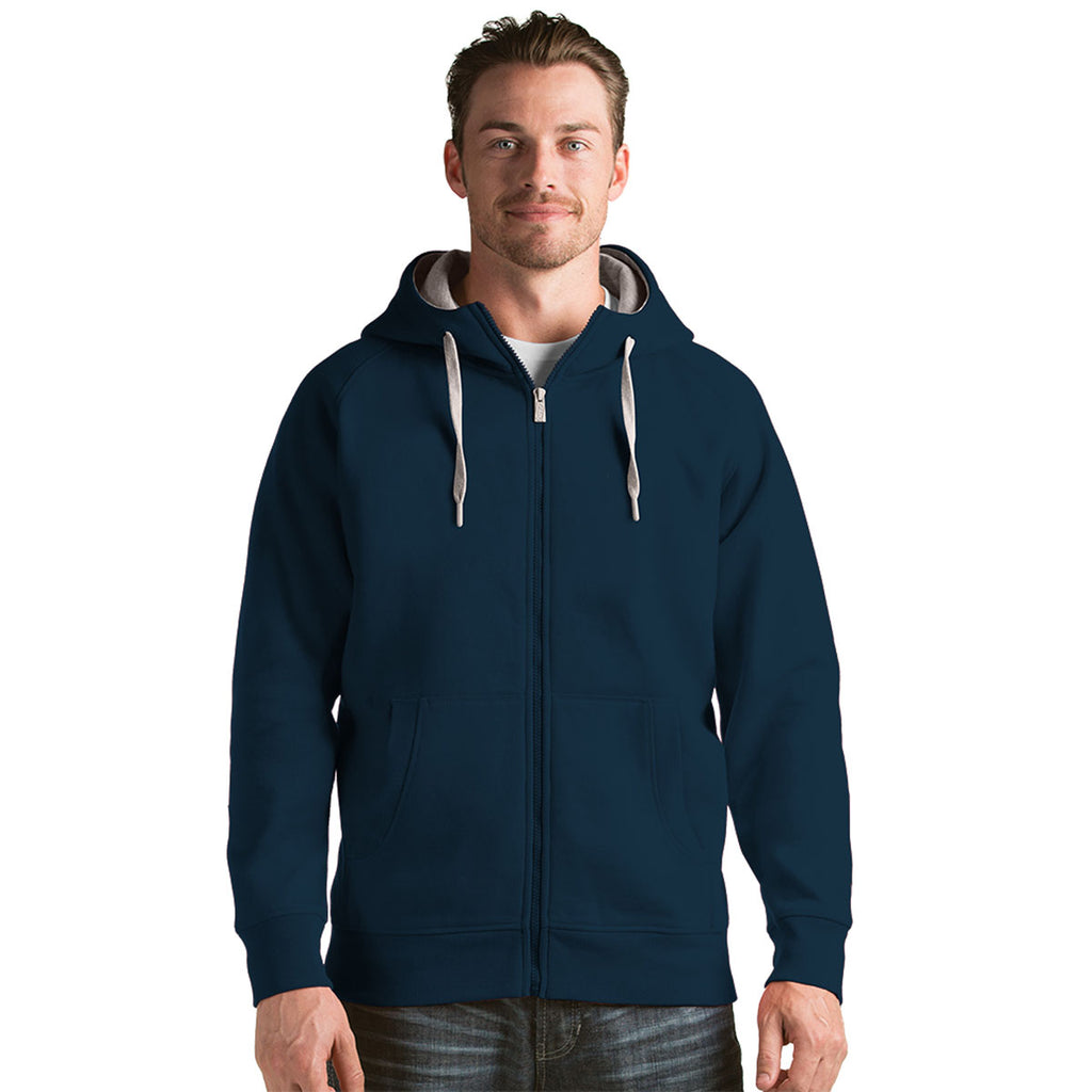 The custom Antigua Men's Navy Victory Full Zip Hoodie is the perfect companion for your company logo. Super soft cotton blends with highly durable polyester to create the ideal outer layer for both camping trips and golf tournaments. Not to mention a great layering piece for a long day of business travel. Cover stitching at the rib cuff and bottom hem adds a stylish design element to the hoodie. Attach a custom logo on the large imprint area to increase your brand awareness at industry events and recruiting outings. Your team will be more than happy to wear this comfortable full zip during the work week and on the weekends.Corresponding Women's Style: Antigua Women's Navy Victory Hoodie