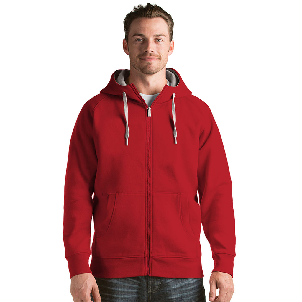 The custom Antigua Men's Dark Red Victory Full Zip Hoodie is the perfect companion for your company logo. Super soft cotton blends with highly durable polyester to create the ideal outer layer for both camping trips and golf tournaments. Not to mention a great layering piece for a long day of business travel. Cover stitching at the rib cuff and bottom hem adds a stylish design element to the hoodie. Attach a custom logo on the large imprint area to increase your brand awareness at industry events and recruiting outings. Your team will be more than happy to wear this comfortable full zip during the work week and on the weekends.Corresponding Women's Style: Antigua Women's Dark Red Victory Hoodie