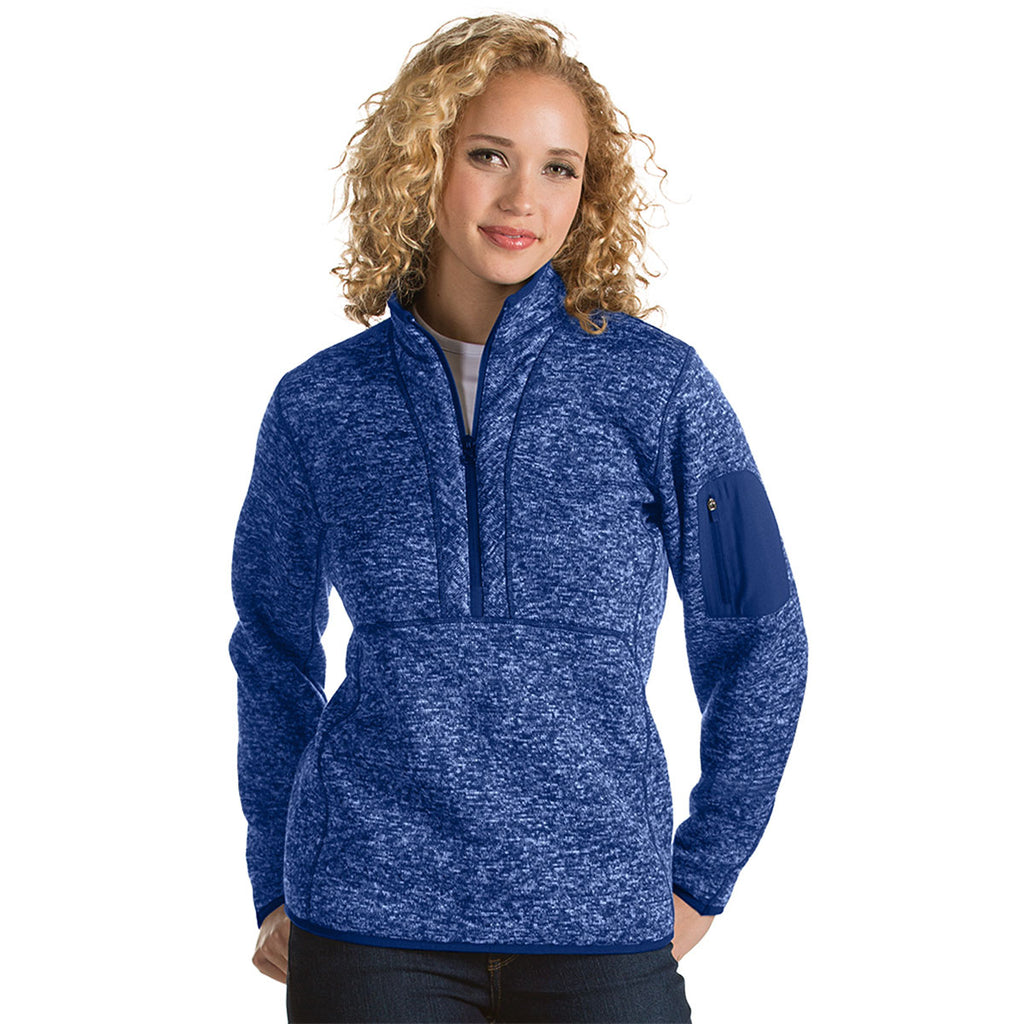 Give away the custom logoed Antigua Women's Dark Royal Heather Fortune Quarter Zip before the start of the next company sponsored golf tournament. Make sure to add your embroidered corporate logo to keep your brand in the minds of customer prospects. One-hundred percent brushed back heather sweater knit fabric keeps you comfortable all day long. Dyed to match cover stitch detailing enhances the visual appeal of the sweater-like quarter zip. The interior of the jacket traps body heat to keep you warm on cold weather camping trips. Binding at the cuff, collar, and bottom hem complements the stylish welded sleeve pocket. Your employees will love receiving this custom sweater quarter zip.Corresponding Men's Style: Antigua Men's Dark Royal Heather Fortune Quarter Zip