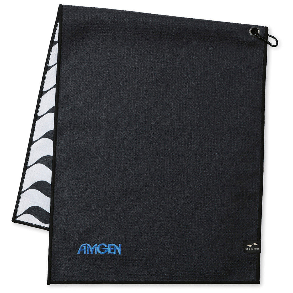 Your brand's personalized logo will always be highly visible on the golf course when it's added to the Slowtide Black Links Golf Towel. Great for tradeshow giveaways or corporate golf outings, it measures 39" long by 14" wide and features a convenient metal carabiner clip so it can be attached to any golf bag.