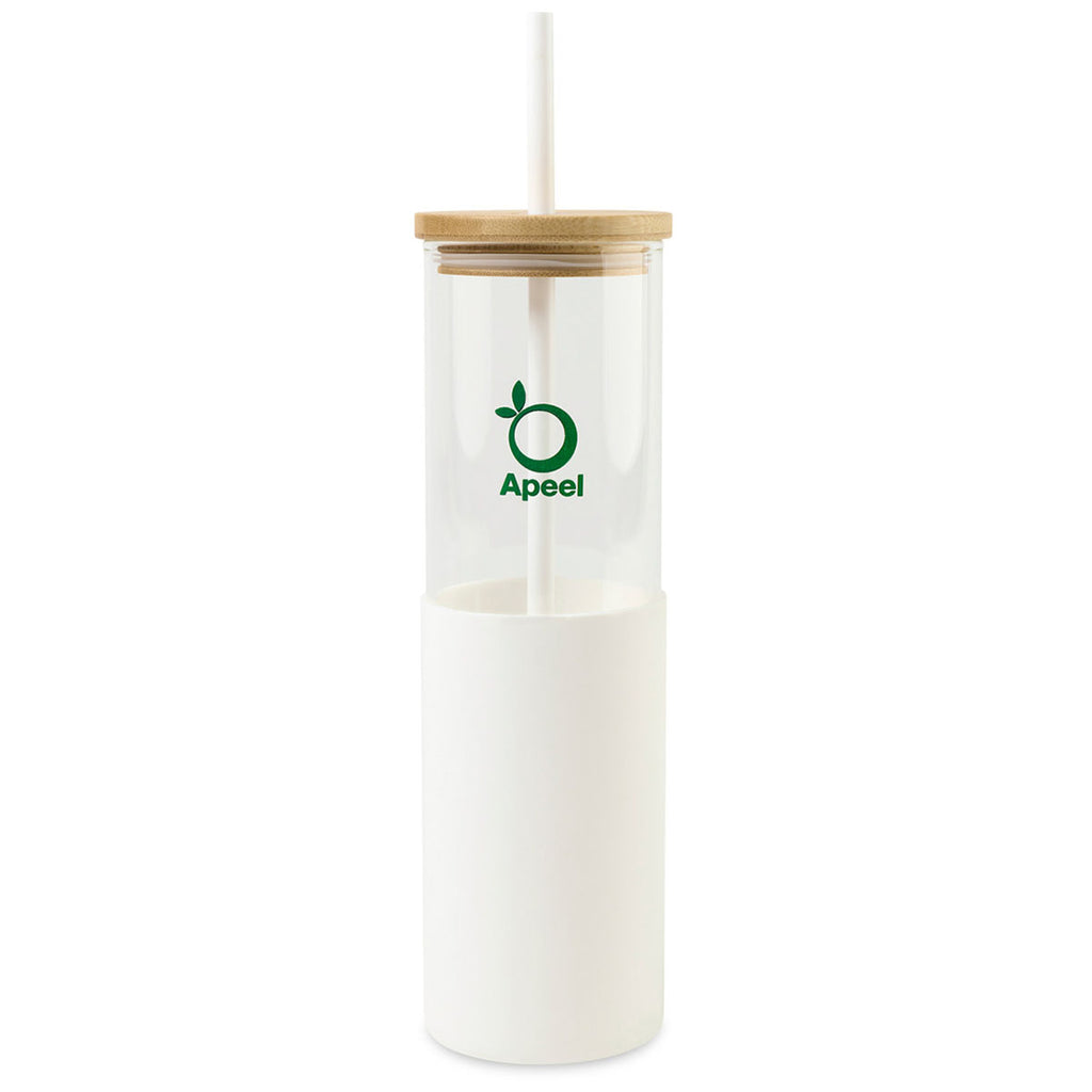 The Aviana White Journey Glass Tumbler with Straw - 20 Oz is the perfect way for clients, colleagues, and customers to show off your company's custom logo wherever they go. This on-trend tumbler features on-trend touches like a contrast silicone sleeve, screw top bamboo lid, and reusable straw.