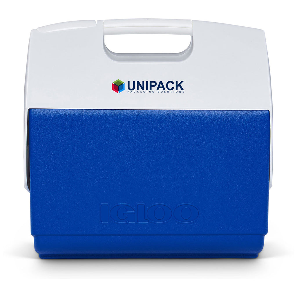 The Igloo White-Majestic Blue Playmate Elite 16 Qt Cooler is a summertime accessory that will never go out of style. Along with its iconic appearance, this portable cooler comes complete with a convenient push-button lid design. It's also available in an array of color options, meaning there's sure to be one that effectively highlights your company's custom logo or design.