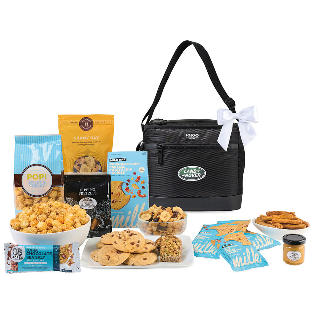 Add your company's custom logo to the Gourmet Expressions Igloo Black Maddox Marvel Gourmet Cooler to create a personalized gift that is great for important customers or clients. Along with a stylish portable cooler, this set Includes an array of sweet and salty gourmet snacks that everyone will want to get their hands on.