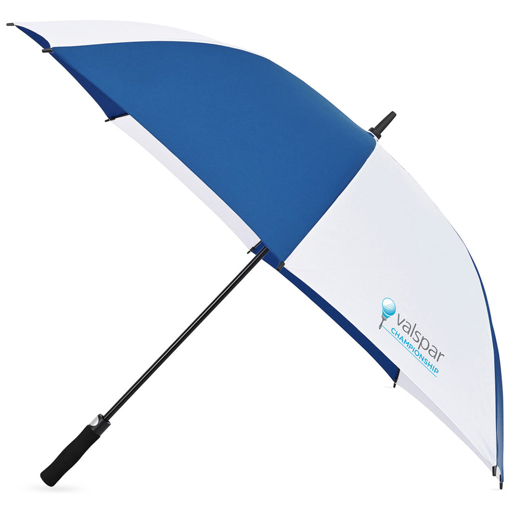 Stay dry with a custom Elements Royal/White 60" Recycled Auto Open Golf Umbrella. This large umbrella is perfect for those spring showers that pop up in the middle of your game or to protect you from the sun. Made from recycled materials, the umbrella opens with a single click and closes in the same way. A wonderful gift.