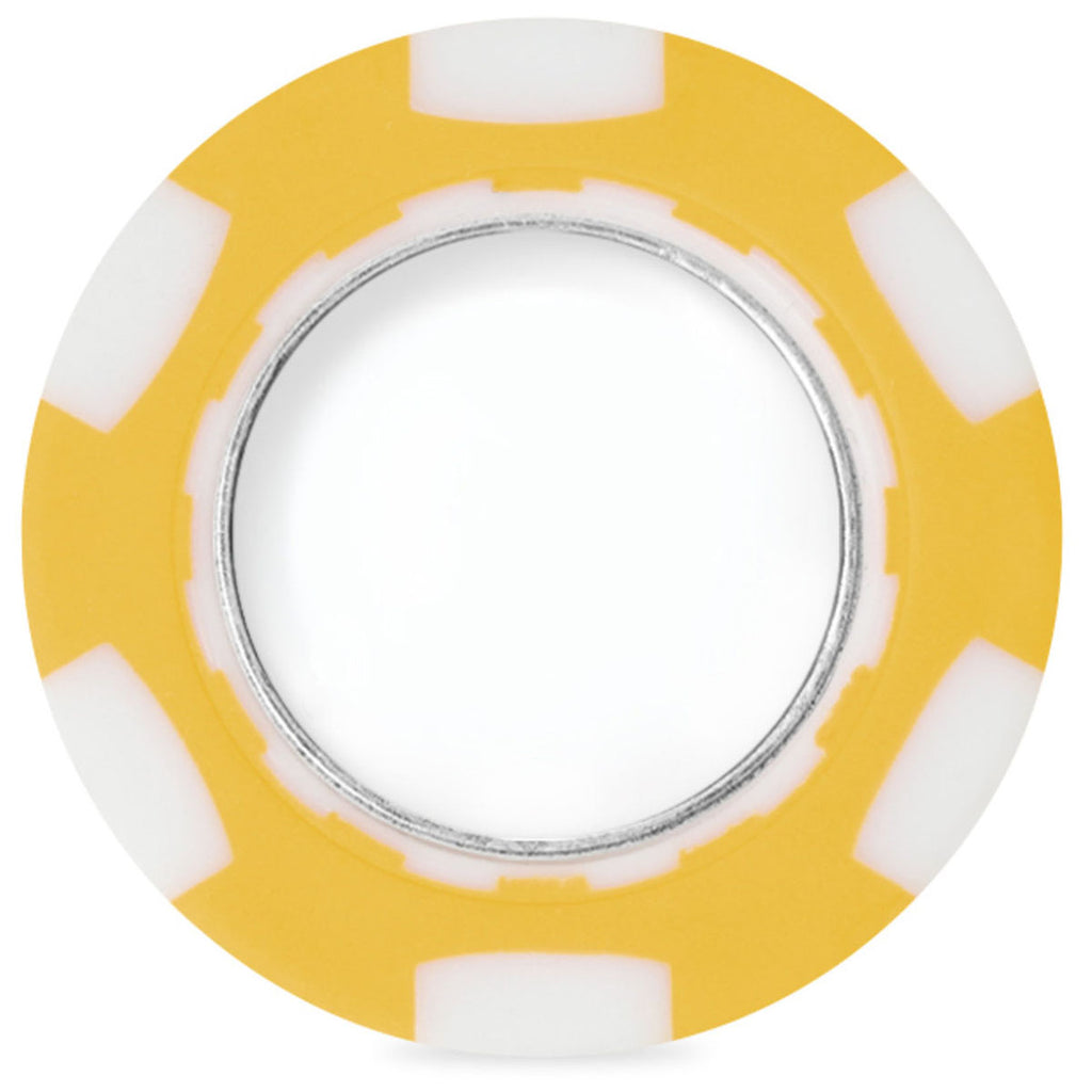 Ahead Yellow/White Poker Chip with Ball Marker with a corporate logo is ideal for tournament play, as the magnetic ball marker sits in the center of the chip. Mark your ball position without interfering with the putting line of others. Get your logo seen each time this marker is used on the course. Ideal for a pro shop impulse buy.