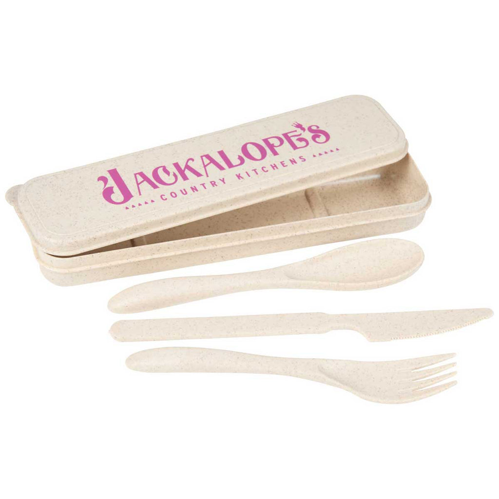 Print a logo of your company on the Leed's Beige Bamboo Fiber Cutlery Set - let the bamboo case show off your brand! This set includes a bamboo fork, spoon and knife in a convenient carrying case - perfect for eating meals on the go. Customize the set and it'll be good to go as a giveaway for your trade shows and recruiting events or as a personalized gift for your long-time clients and employees.The minimum order for this product is 100 pieces.