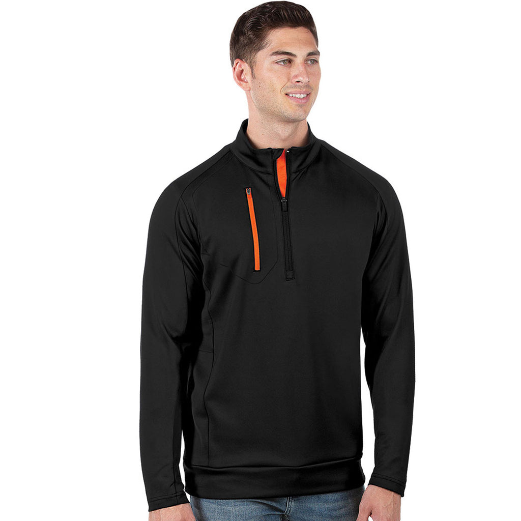 Antigua Men's Black/Mango Genereation Quarter Zip Up with custom design is a unique option for nearly any occasion. The sleek polyester rich spandex blend is easy to wear over a tee or long sleeve shirt with the 1/4 zip pullover style. Add a company logo to the pullover to use as employee gifts or as part of a uniform for those who work in the public with potential customers. Create a unique design to give as client gifts for loyalty or large purposes and enjoy seeing your brand displayed as people wear the zip up. A great addition to any wardrobe or logoed apparel line, this is a true must have for the pure versatility of the garment. Place an order today.Corresponding Women's Style:Antigua Women's Black/Mango Generations Full Zip Up Jacket