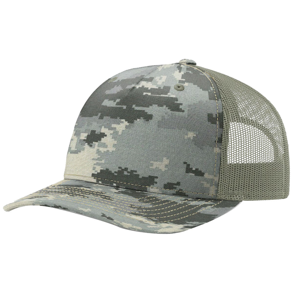 Add embroidery to the Richardson Digital Camo/Light Green Printed Five Panel Trucker Hat for an easy-to-wear look that is ready for a hard day at work or play. The 5-panel pinch front construction with a camo print will be a hit for hunters, fishers, or those who enjoy the outdoors. An adjustable back means a one-size-fits-most fit. Place an order today.The minimum order for this product is 48 pieces.